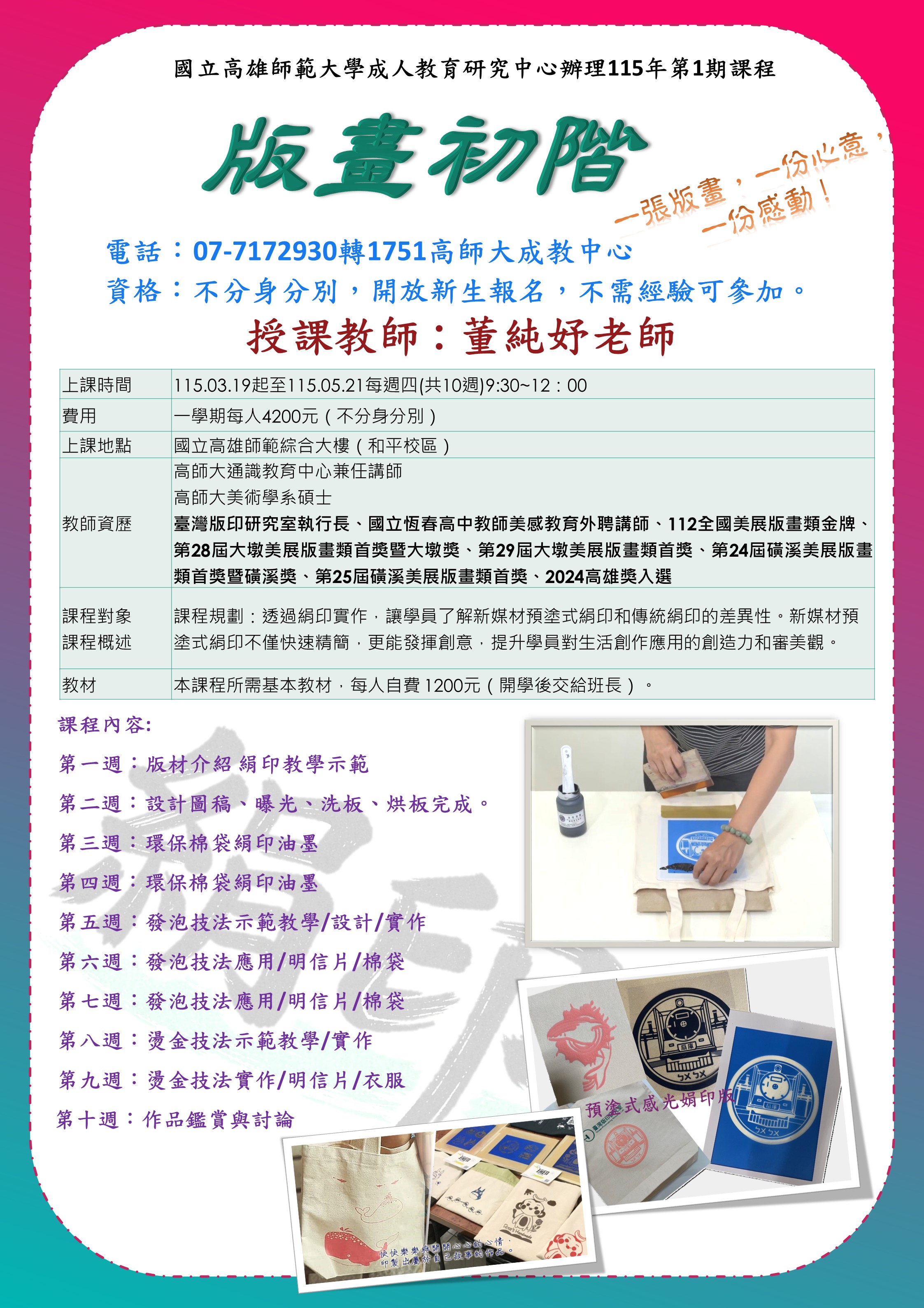 國立高雄師範大學成人教育研究中心辦理115年第1期課程 <版畫初階>招生中