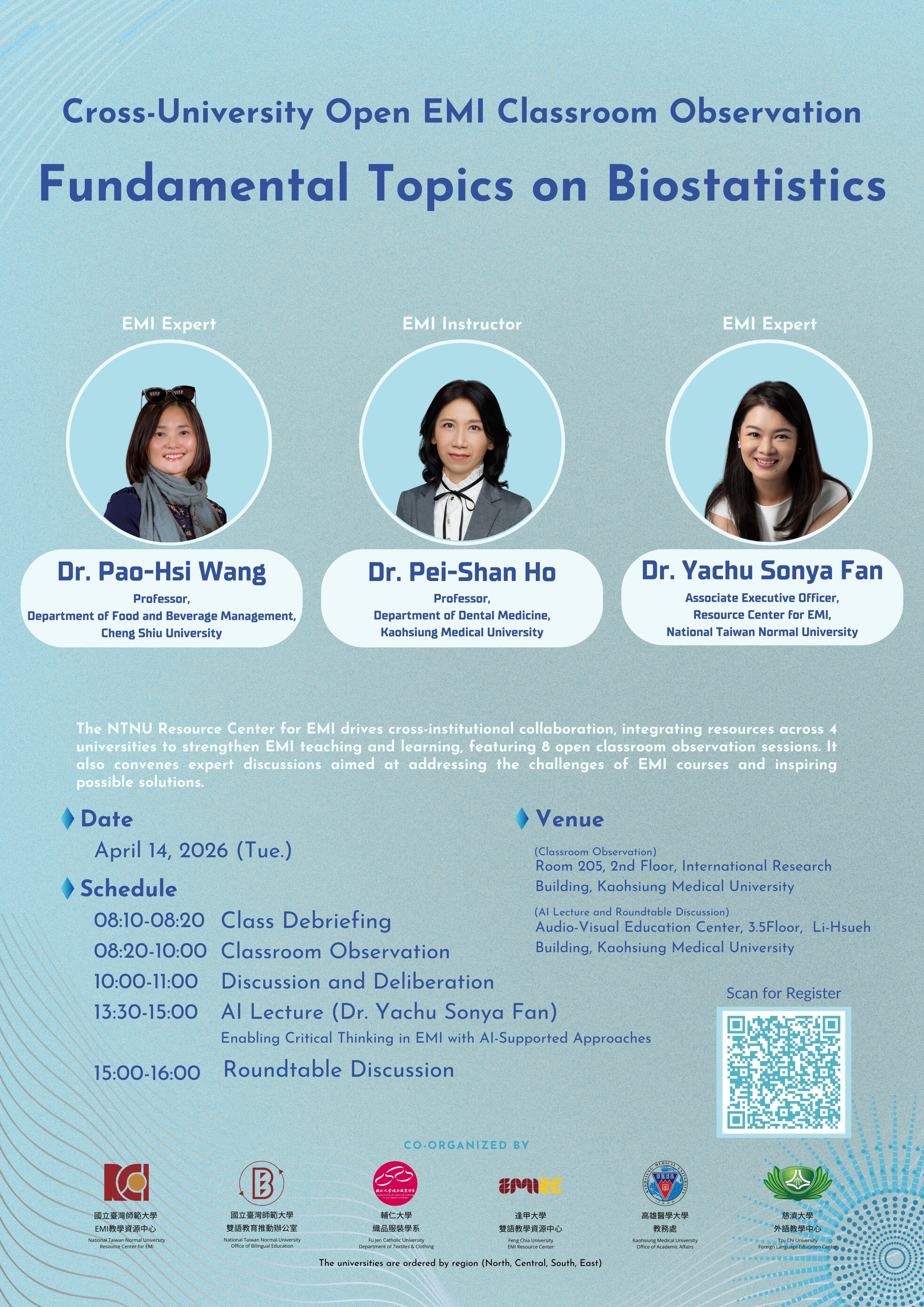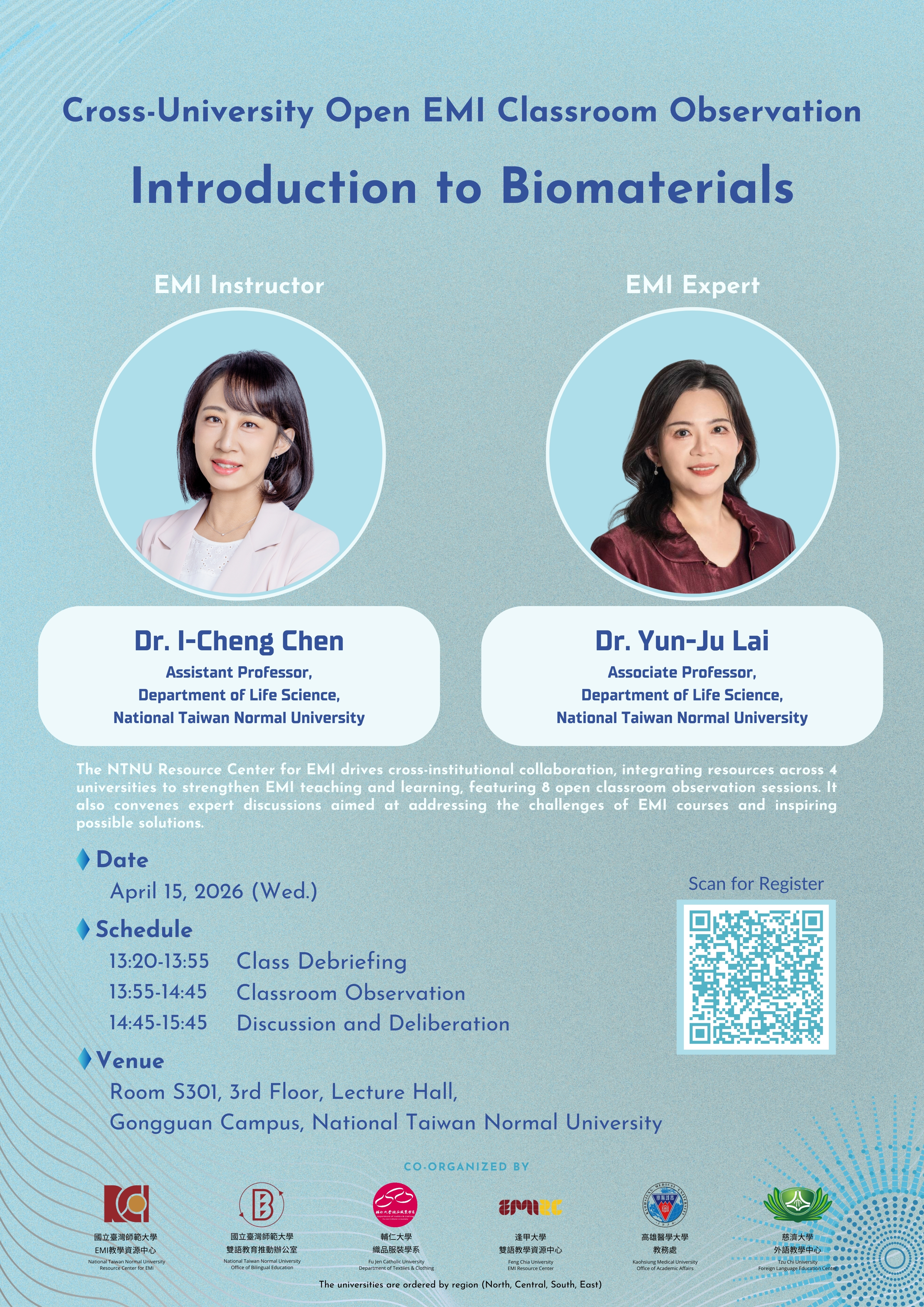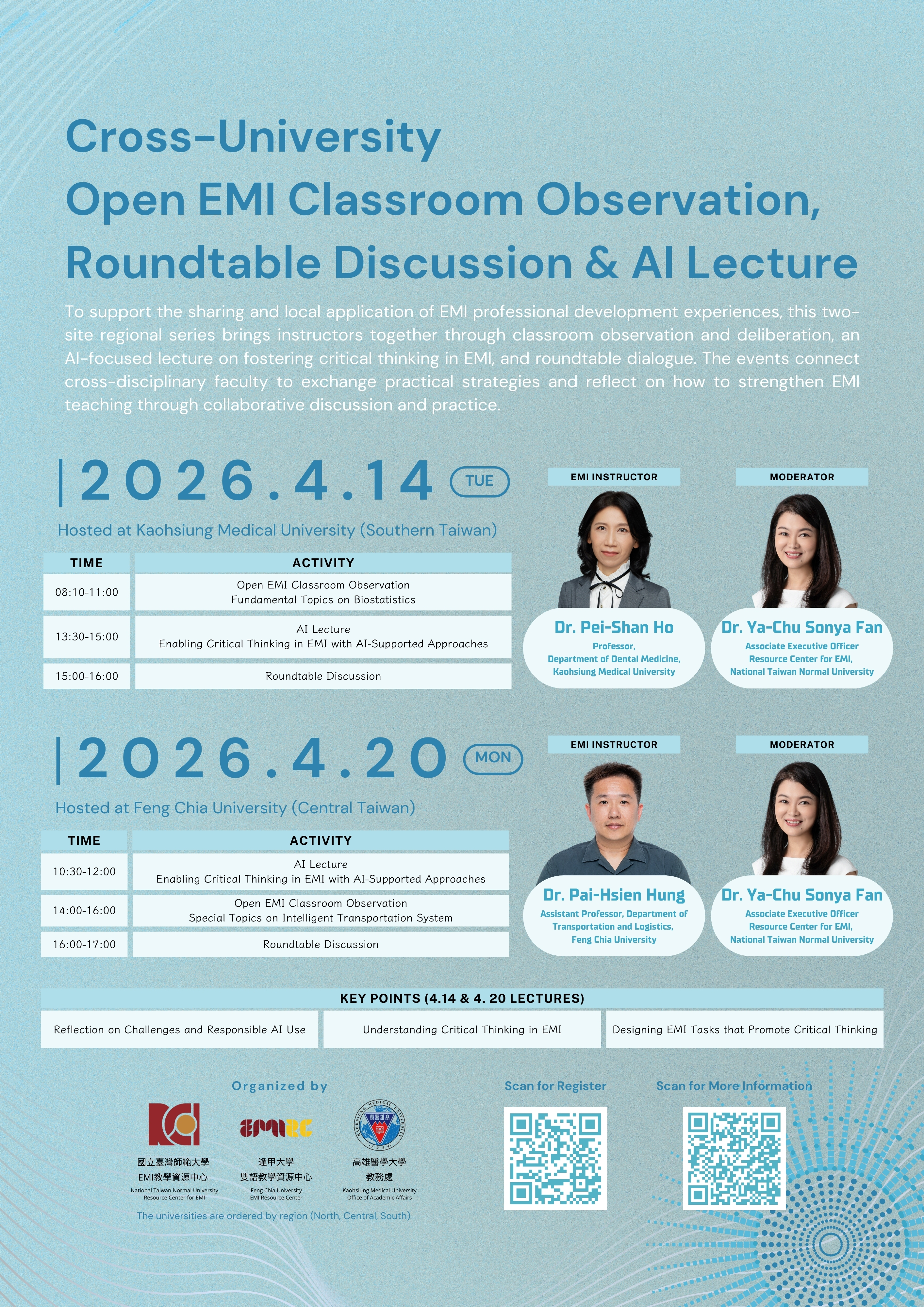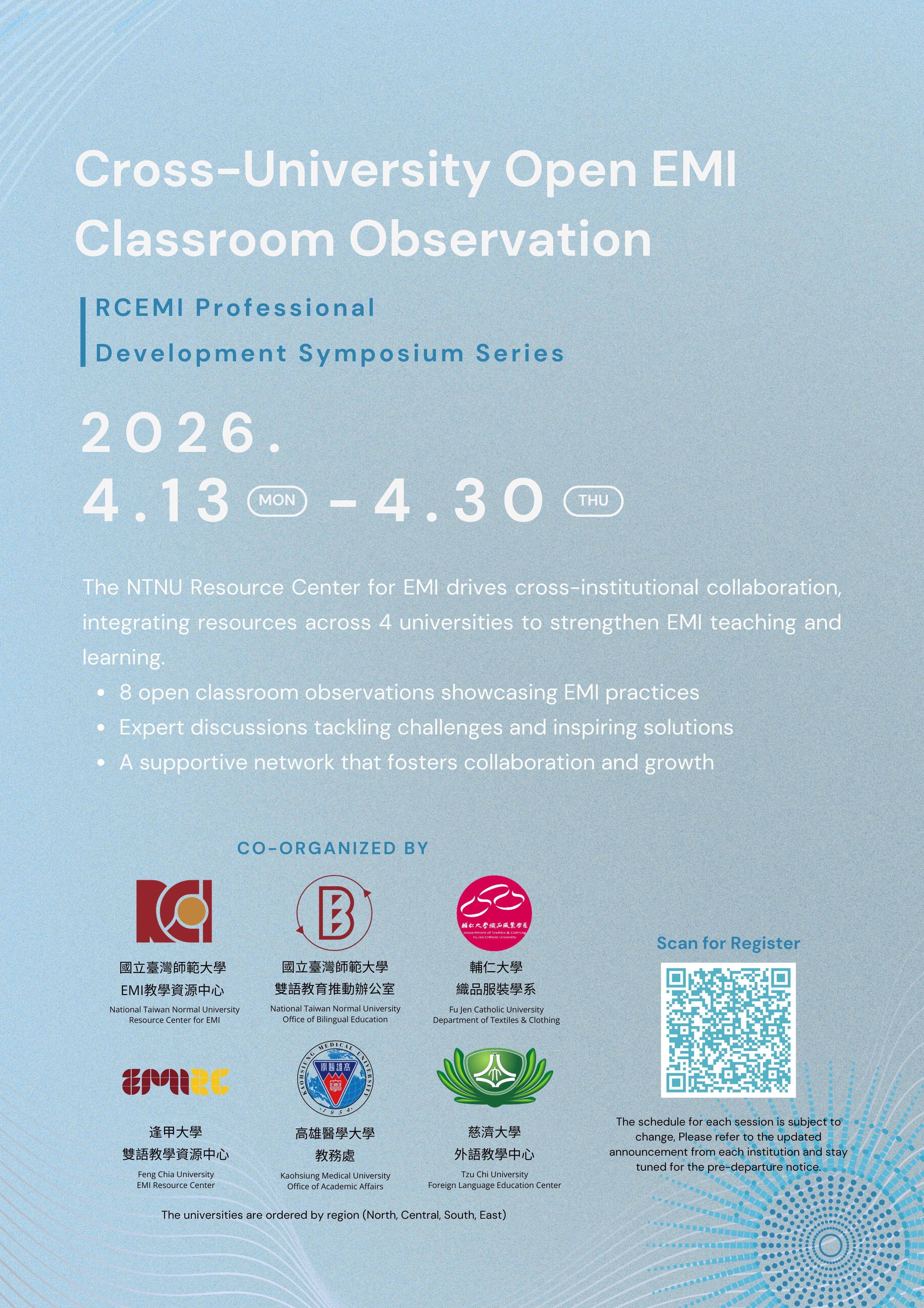 國立臺灣師範大學 EMI 教學資源中心於 114 學年度第 2 學期,與輔仁大學、逢甲大學、高雄醫學大學及慈濟大學合作辦理 8 場跨校公開觀議課、2 場雙語聯盟圓桌會議及 2 場 AI 工作坊,歡迎有興趣之師長踴躍報名參加。