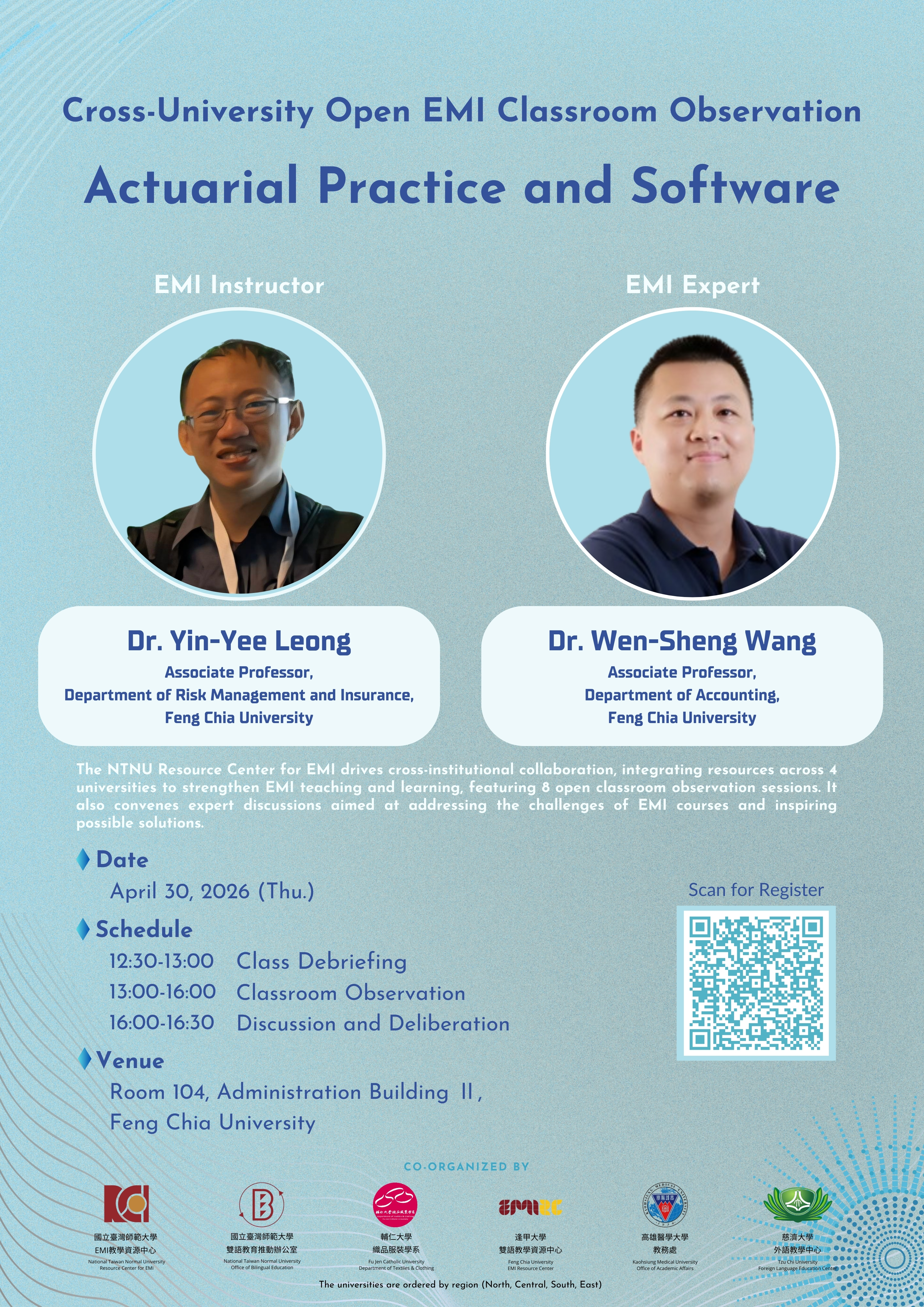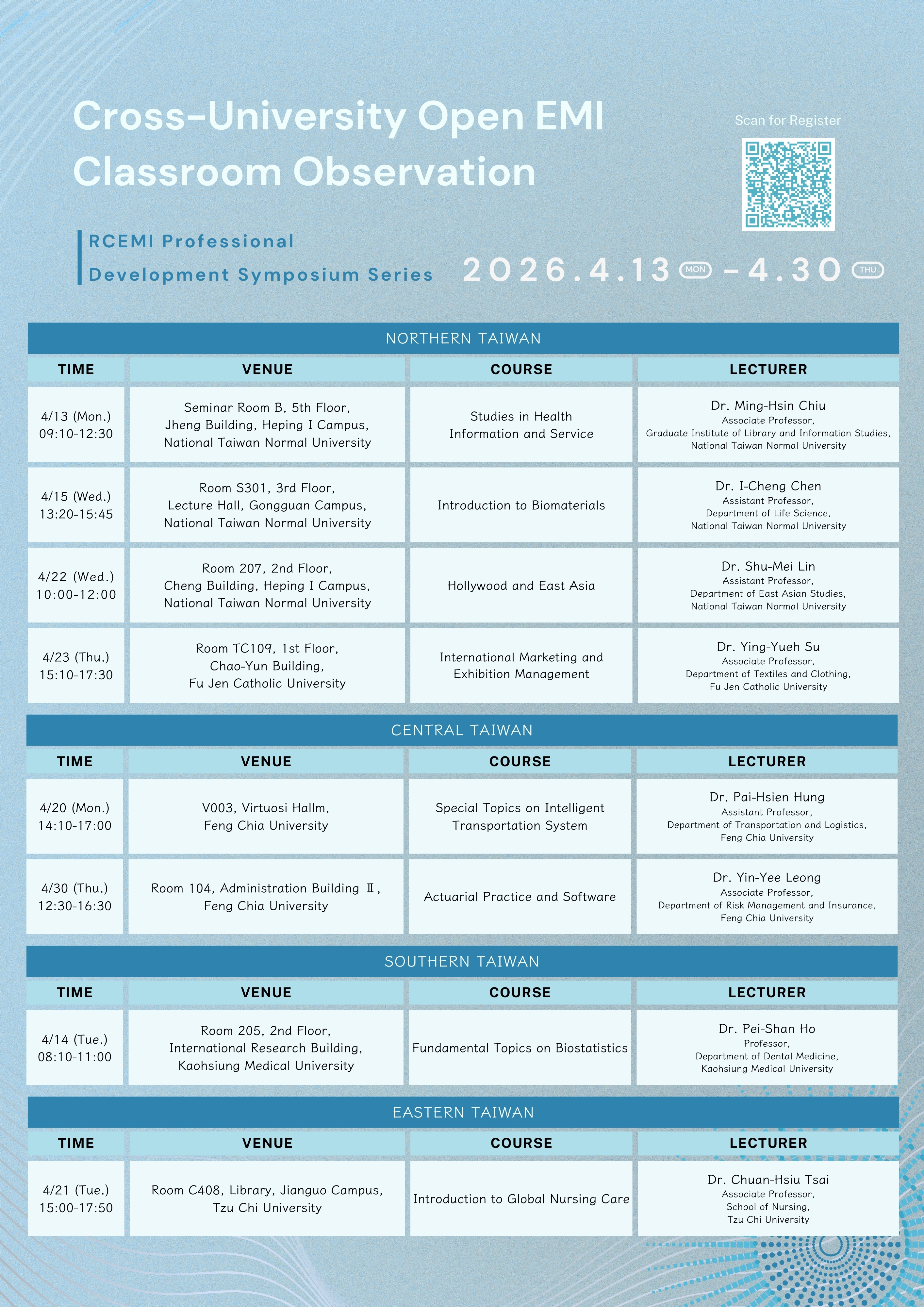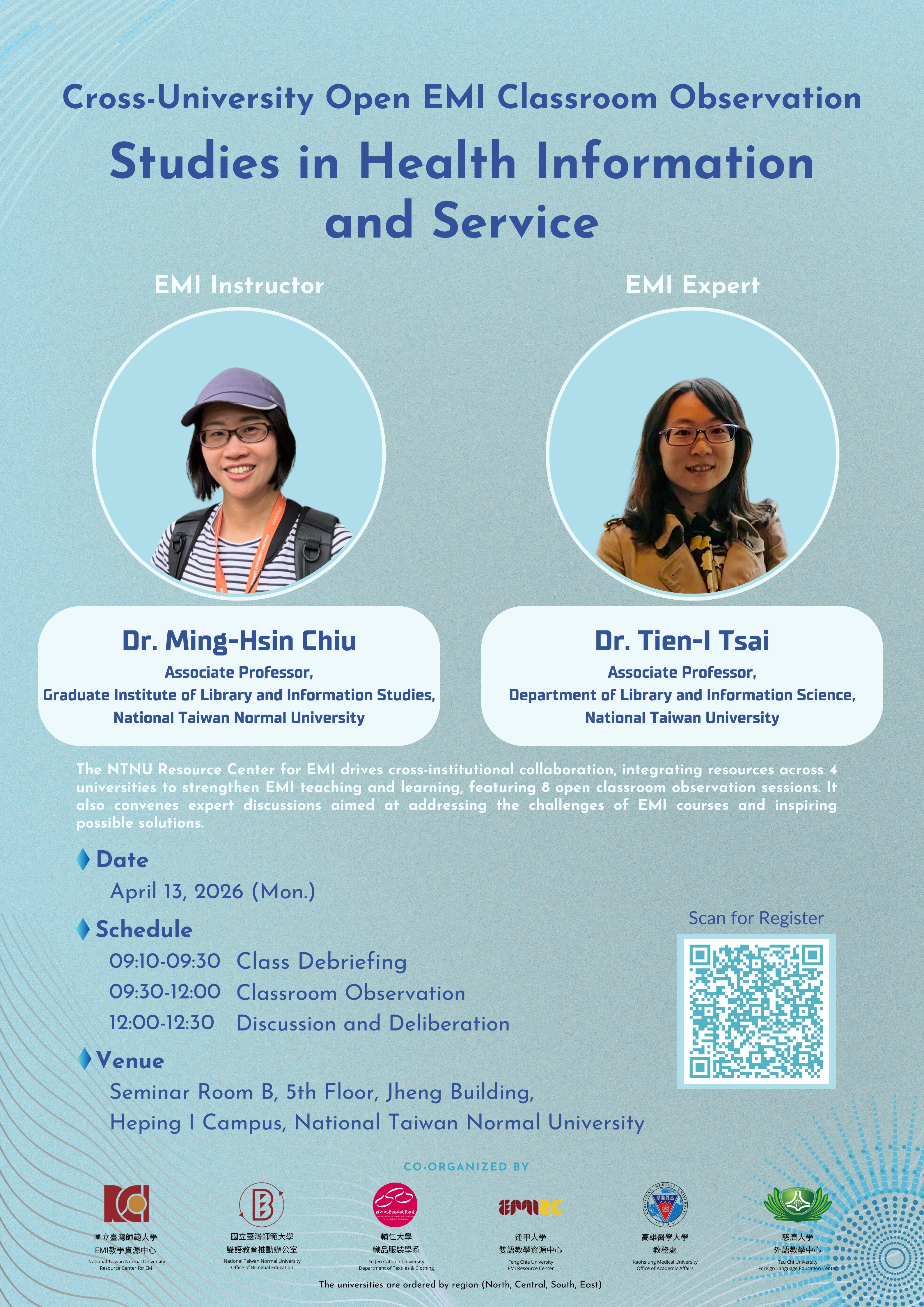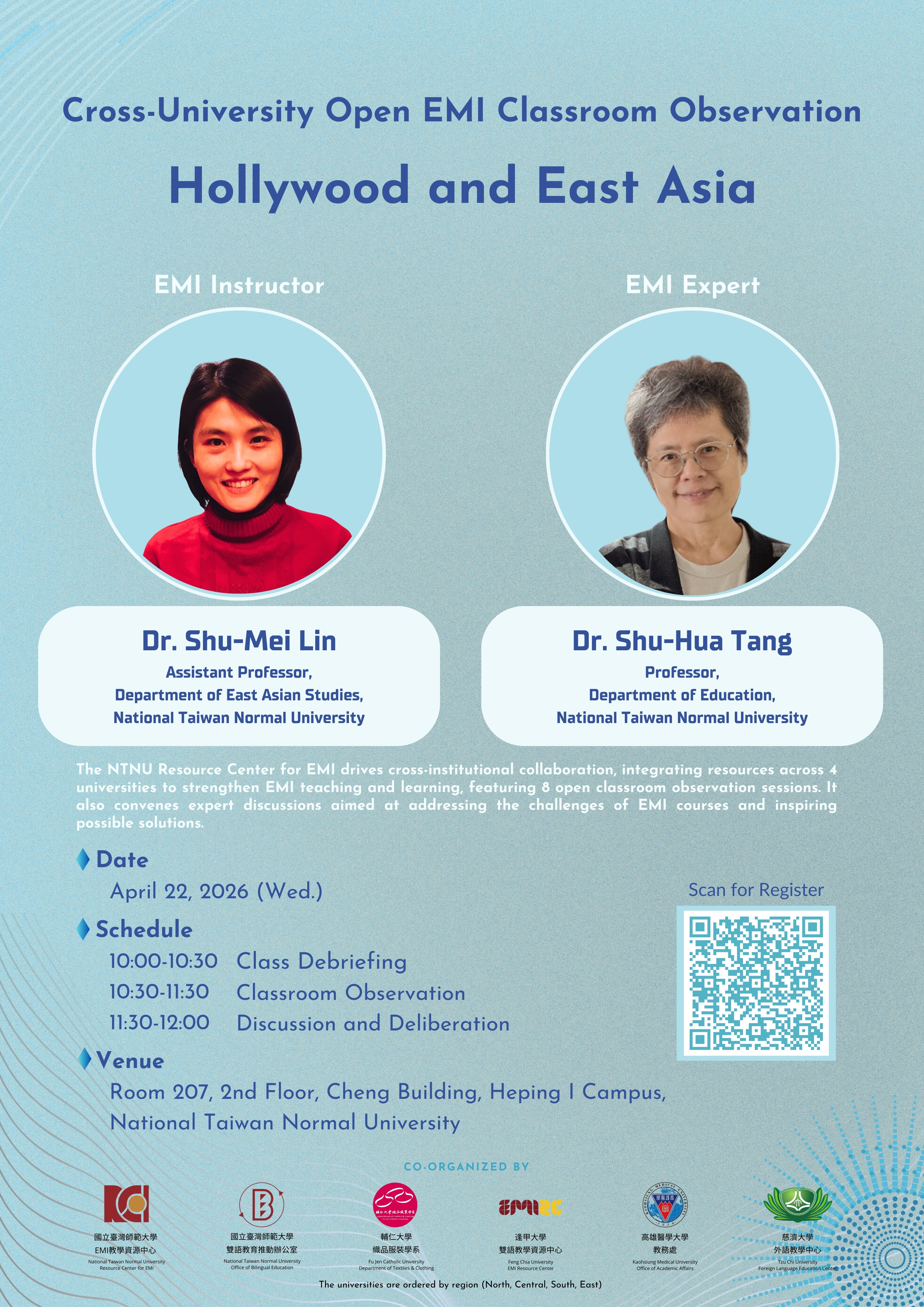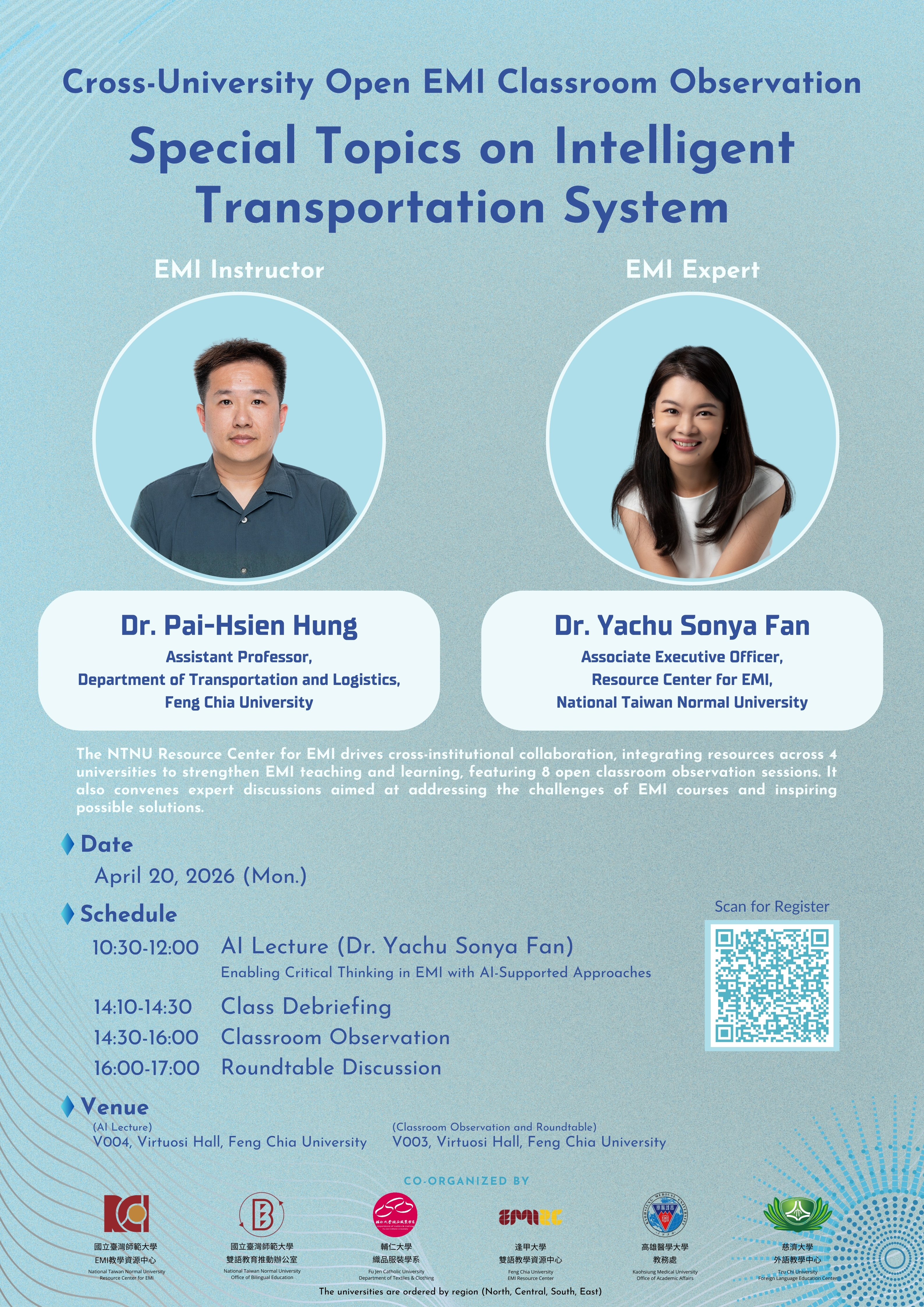國立臺灣師範大學 EMI 教學資源中心於 114 學年度第 2 學期,與輔仁大學、逢甲大學、高雄醫學大學及慈濟大學合作辦理 8 場跨校公開觀議課、2 場雙語聯盟圓桌會議及 2 場 AI 工作坊,歡迎有興趣之師長踴躍報名參加。