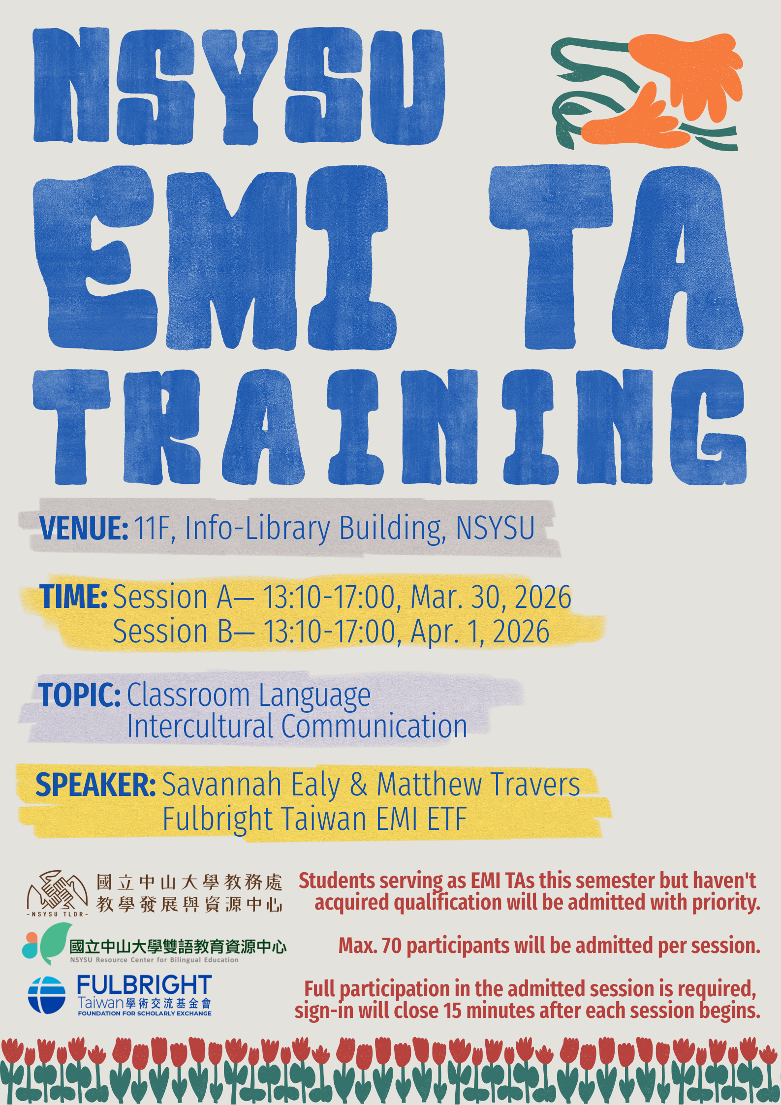 為提升 EMI(English as a Medium of Instruction)課程之教學與學習成效,國立中山大學雙語教育資源中心辦理「114-2學期 EMI 教學助理培訓課程」,邀請 Fulbright Taiwan EMI ETF 教學人員授課,課程內容涵蓋課室語言(含發音)與跨文化溝通,歡迎有興趣之同學踴躍報名參加。