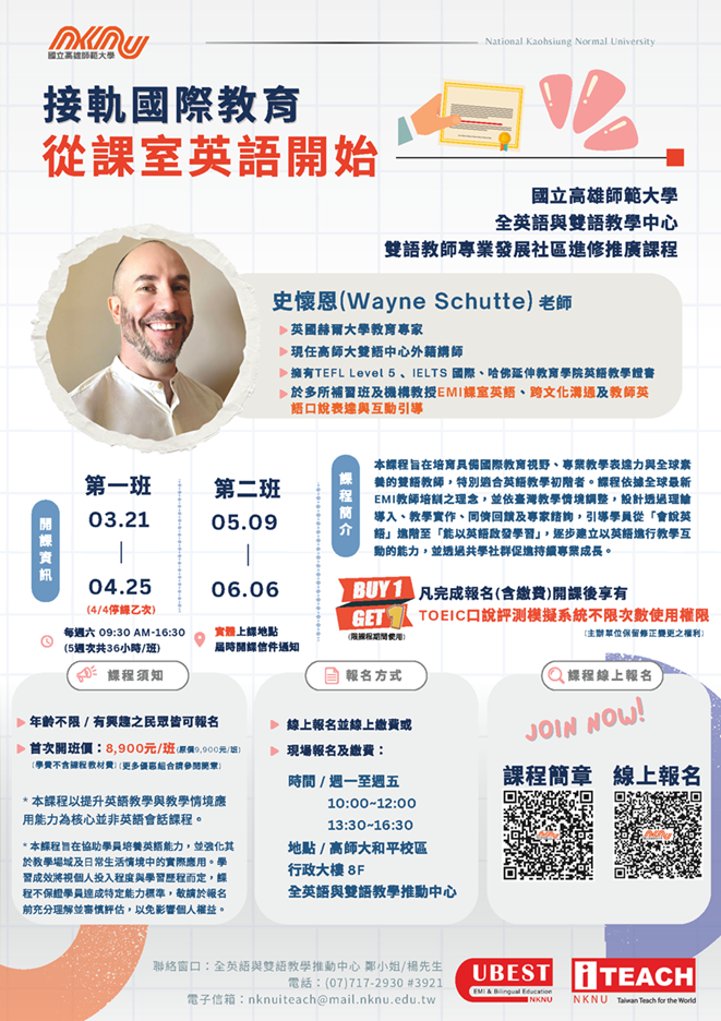 本課程由 EMI 教學實務經驗之外籍講師史懷恩(Wayne Schutte)老師以英語授課,著重課室英語實用表達、教學互動語言及真實教學情境演練,協助同學從「會說英語」進階到「能以英語進行教學與引導」,為未來教學實習與職涯發展提前做好準備。