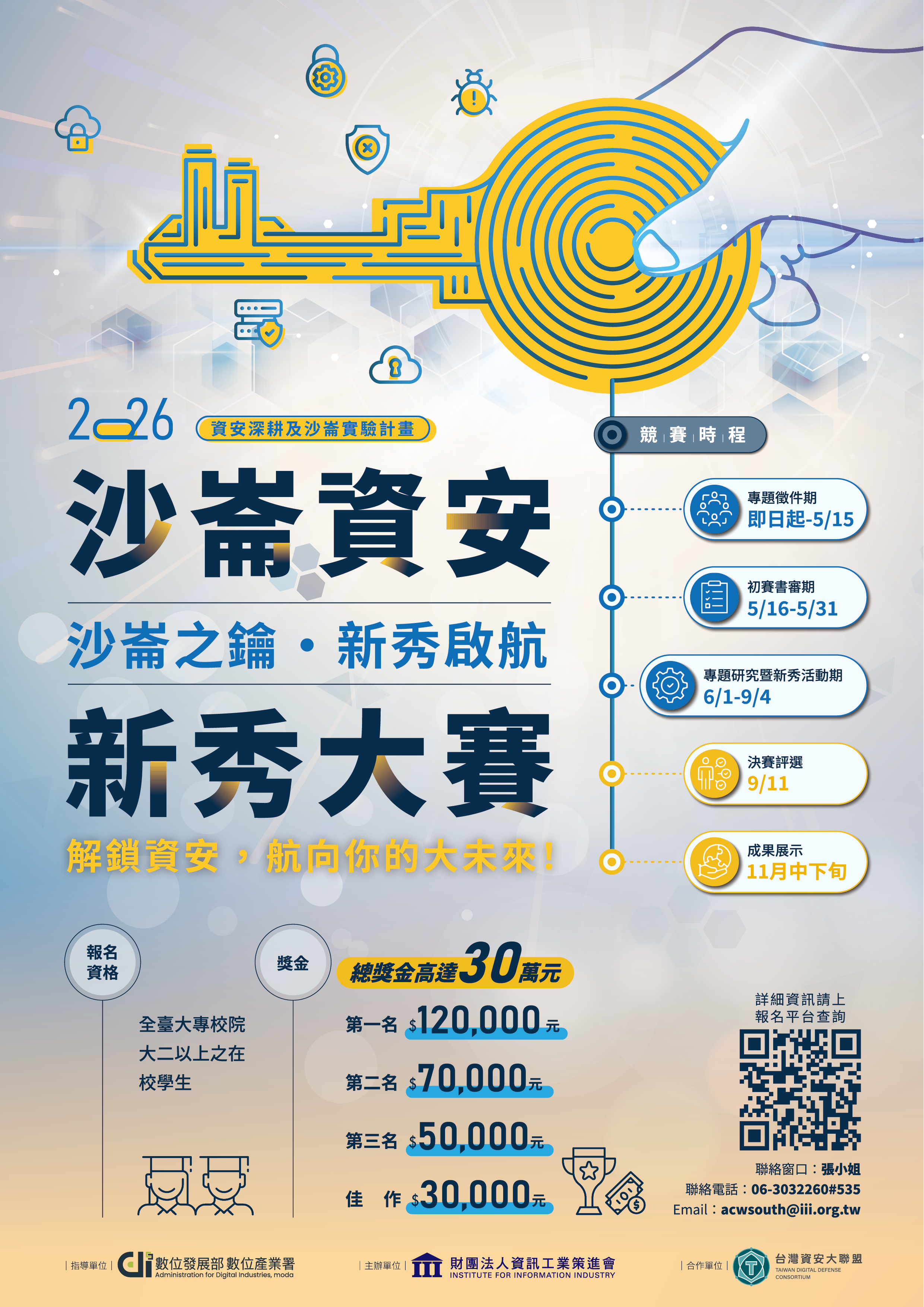主旨:數位產業署為挖掘資安新秀與培育資安人才,辦理「2026沙崙資安新秀大賽」,本競賽組隊報名即日起至5月15日止,敬請本校師生踴躍報名並公告週知,請查照。