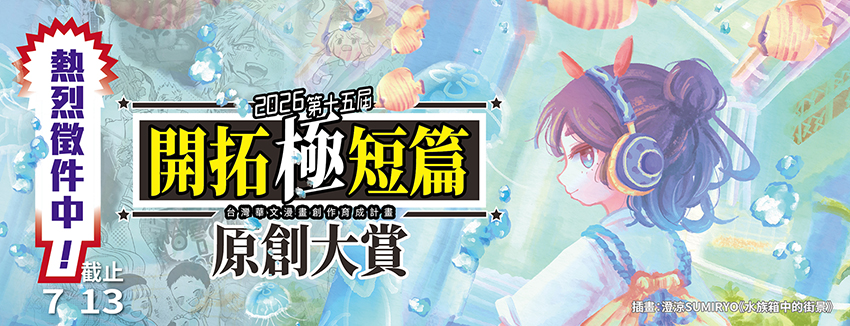 為加強培育推廣台灣原創動漫畫人才,台灣動漫畫推廣協會持續舉辦漫畫相關比賽與活動,秉持推廣優秀原創人才、協助創作者們開創未來的願景,今年2026年第十五屆「開拓極短篇原創大賞」已開始徵稿,即日起至07月13日截止!