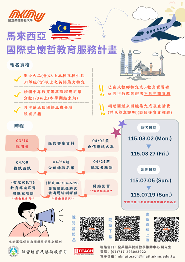 📝 甄選簡章 :2026國立高雄師範大學國外教育見習暨國際史懷哲教育服務計畫甄選簡章