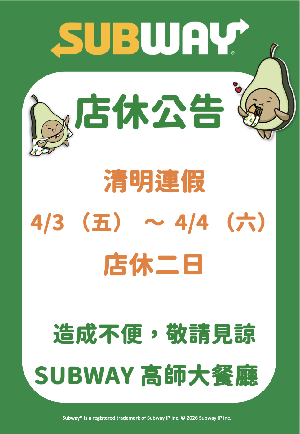 【保管組公告】Subway高師大餐廳 | ⚠️ 清明連假|先別來!