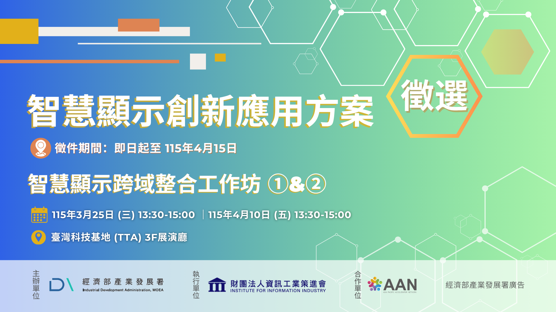 4/10 智慧顯示跨域整合工作坊在正式報名徵案前,歡迎先參加由專家為您拆解「顯示技術與 AI 的整合實務」,幫助您的提案更具商業競爭力!