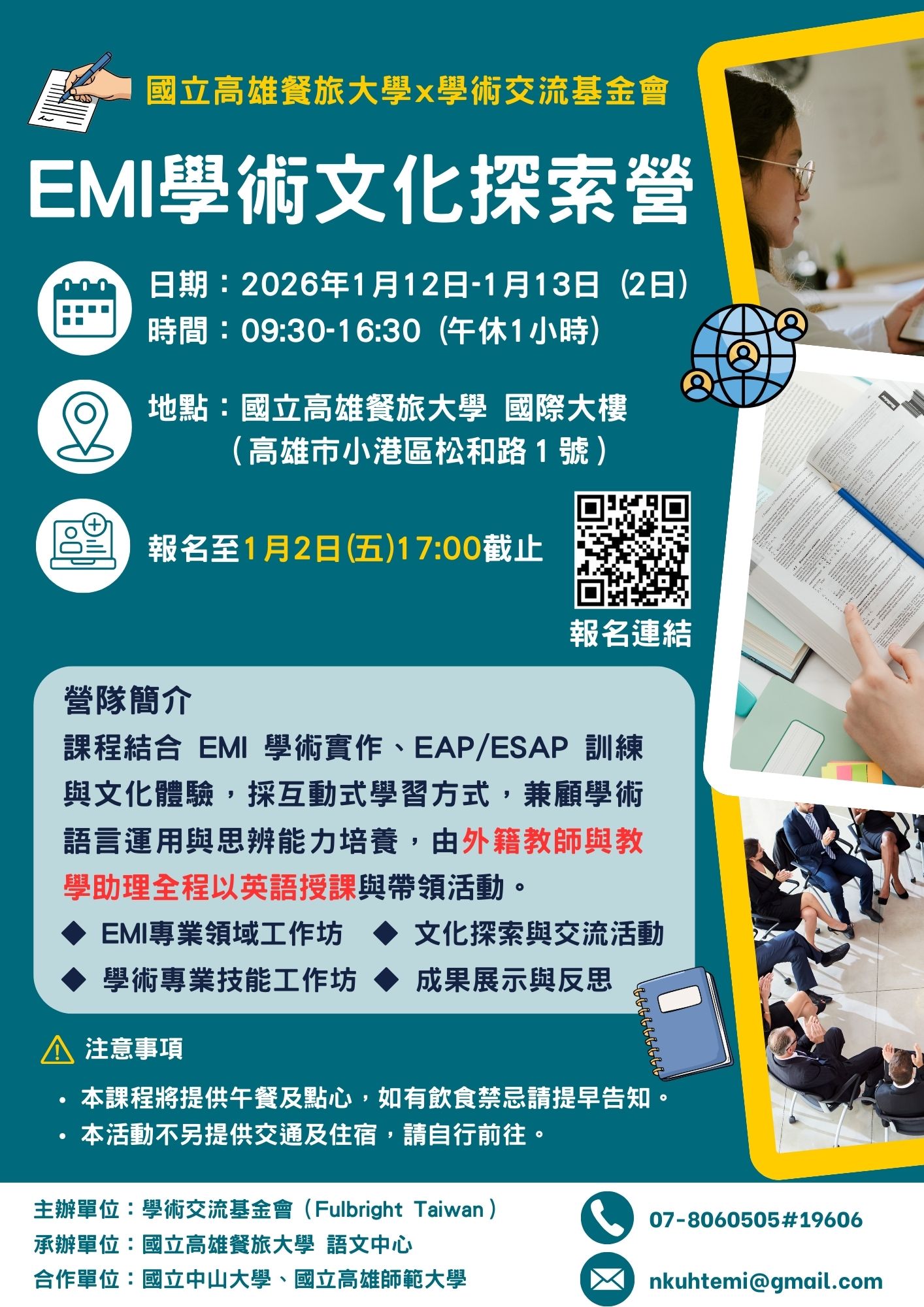 由學術交流基金會(Fulbright Taiwan)與高師大及高餐大攜手辦理的 「EMI 學術文化探索營」,邀請對 EMI 課程、學術英語與國際交流有興趣的大學生參與,透過兩天密集而多元的活動,全面強化你的學術與職涯競爭力。
