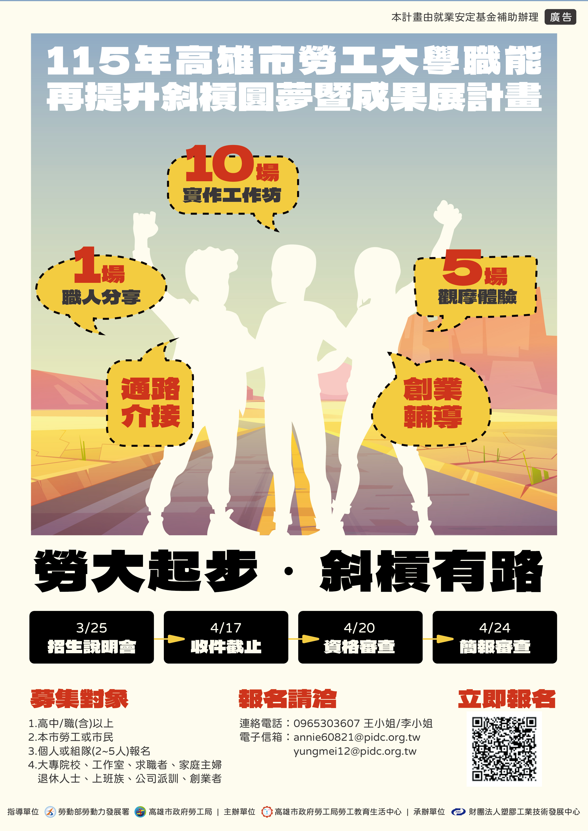 四、招募對象與資格:居住於高雄市之勞工及滿 15 歲市民,高中(職)以上學歷;可個人報名或 2–5 人團隊報名。鼓勵師生創業團隊及育成進駐廠商踴躍參與。