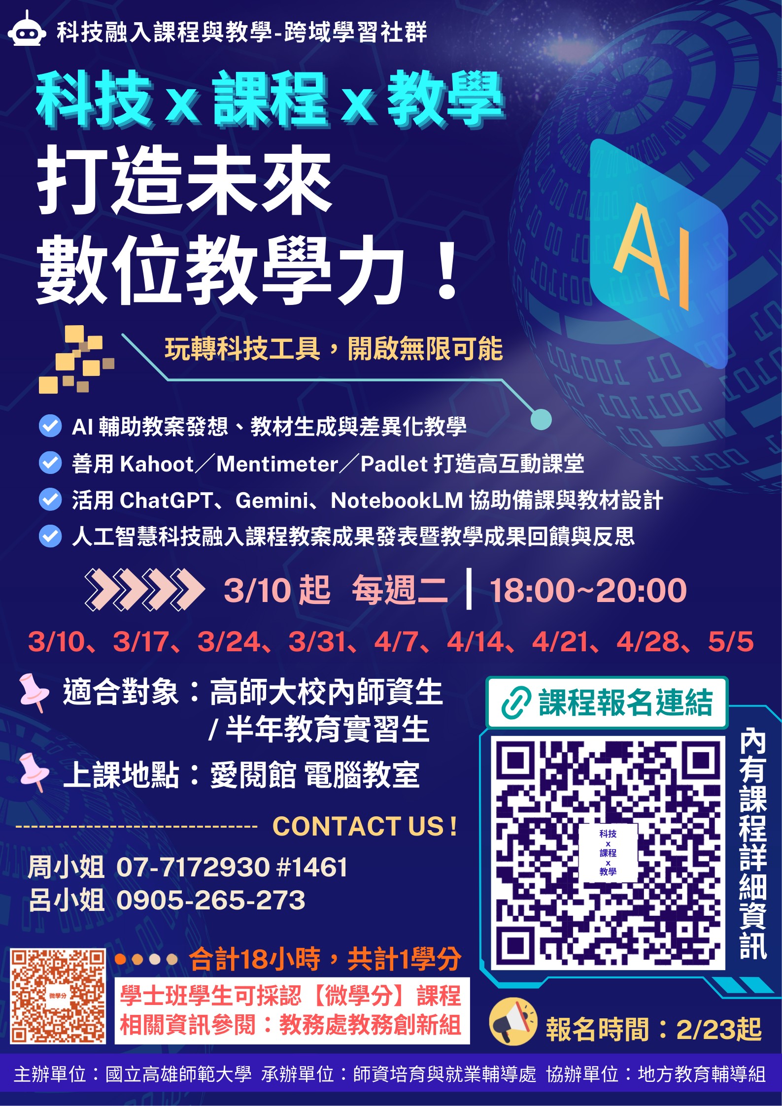 學士班學生全程上完18小時課程,可採認1學分(相關規定請見高師大-教務處教務創新組-微學分)