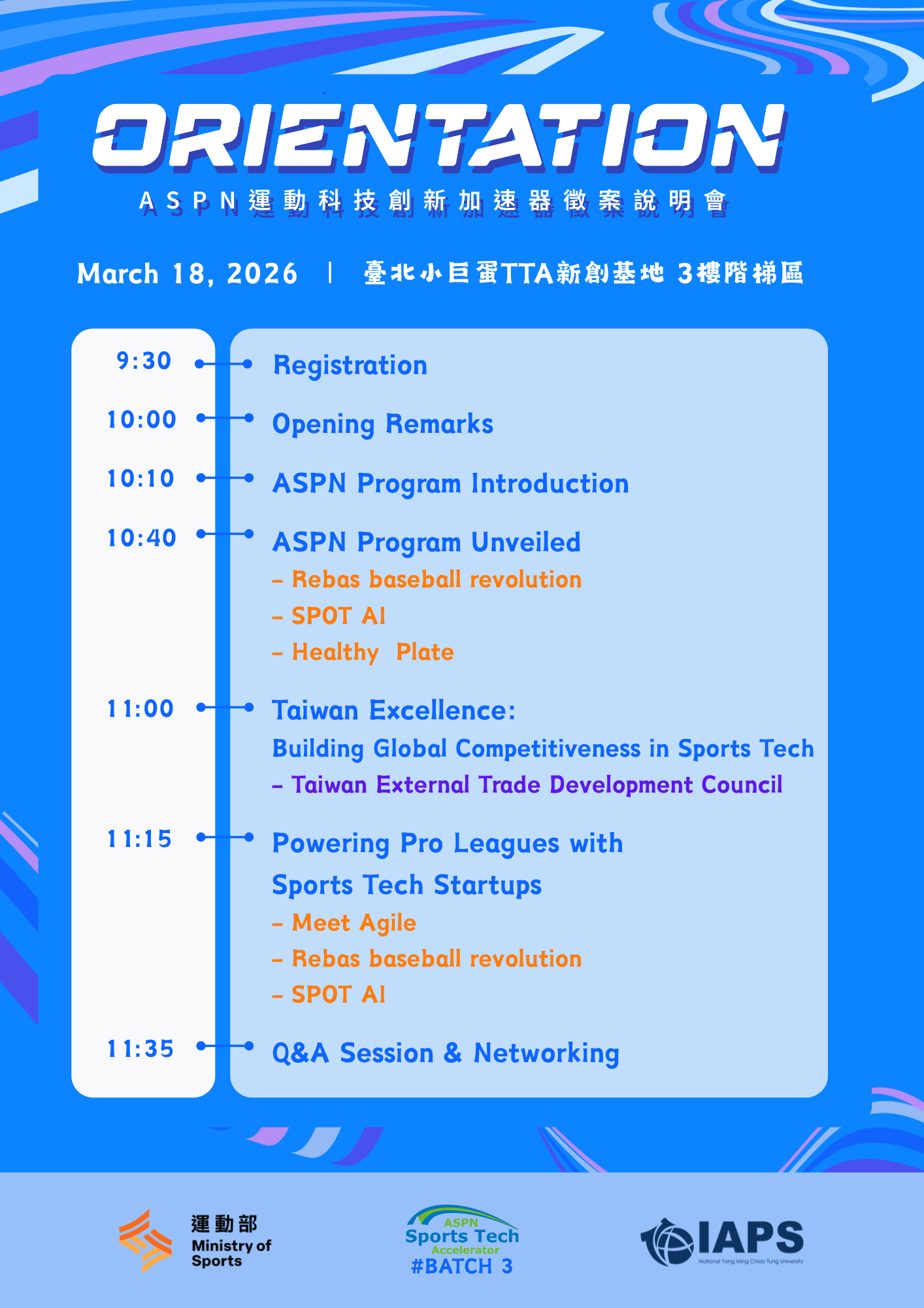 一、「APEC運動政策網絡(APEC Sports Policy Network, 簡稱ASPN)」於105年由我國倡議成立,屬亞太經濟合作會議(APEC)人力資源發展工作小組(HRDWG)教育分組(EDNET)。本部與國立陽明交通大學產業加速器中心自107年起結合我國運動科技優勢辦理本計畫,透過國內外相關資源交流及整合培育運動創新人才。迄今已培育來自25個國家、130組運動創新團隊。