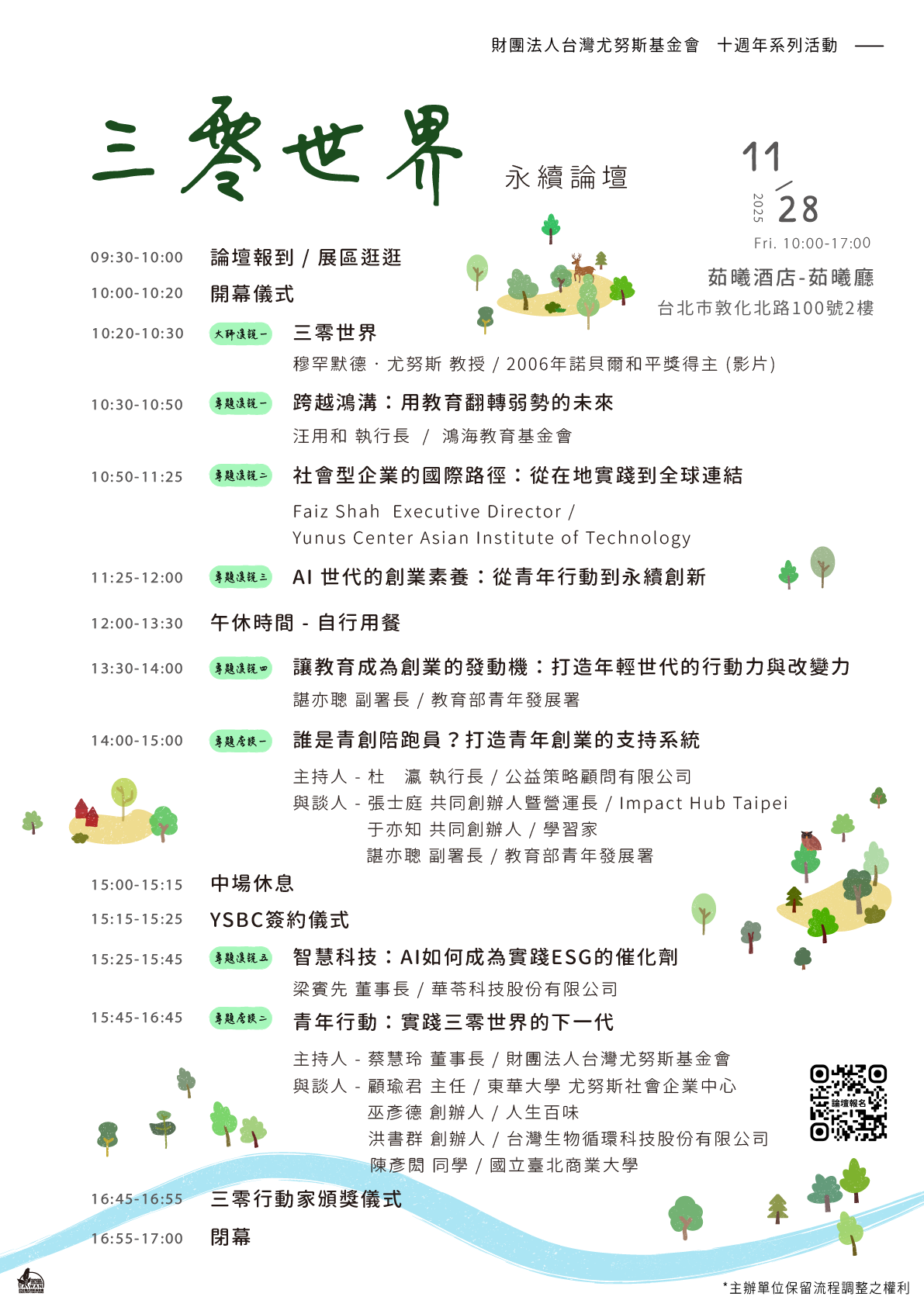 念,推動「三零永續目標」—零淨碳排放、零貧窮與零失業。基金會亦與多所大專院校合作設立「尤努斯社會企業
