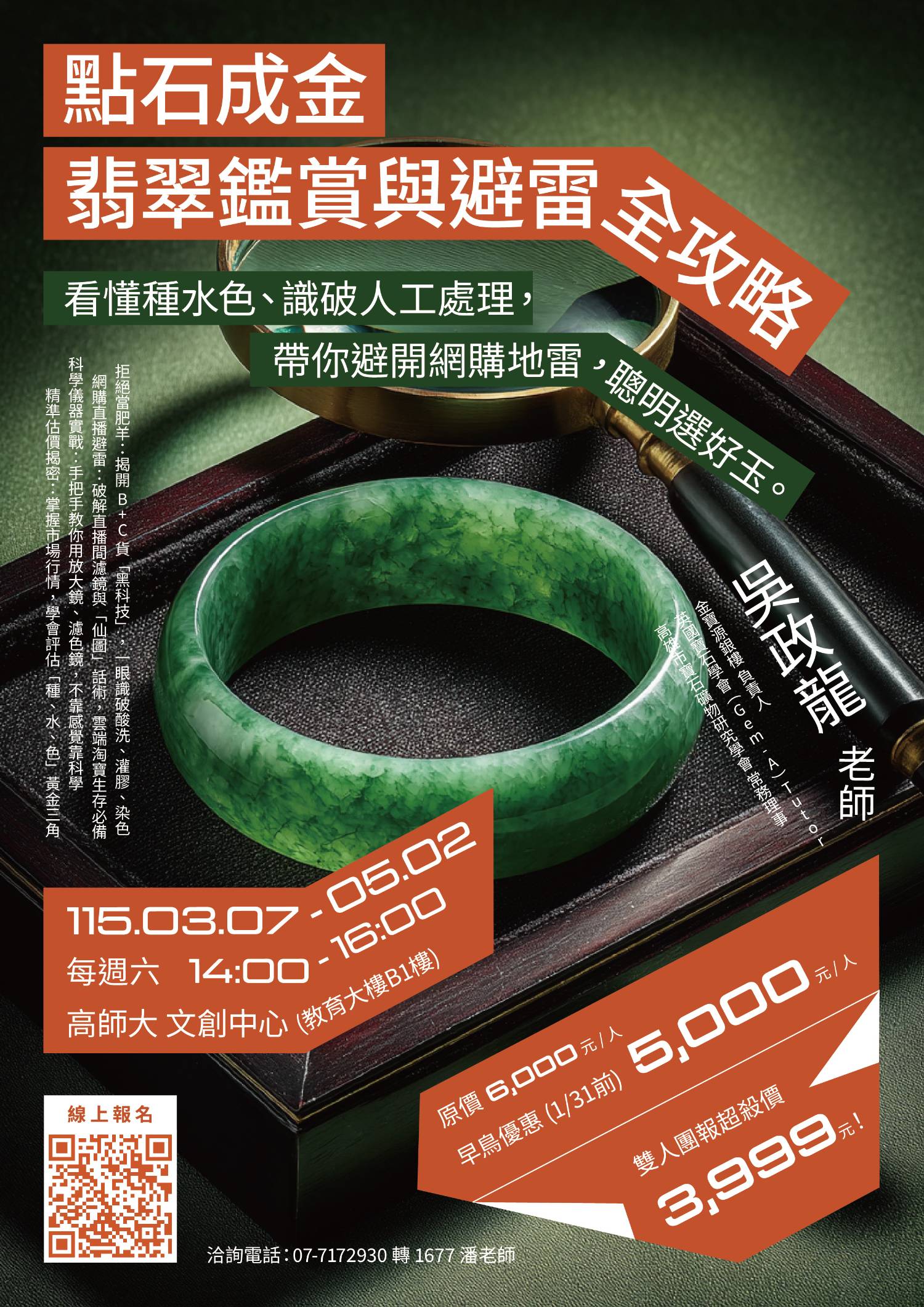 本校文創中心 114-2 學期隆重推出 【點石成金:翡翠鑑賞與避雷全攻略】 課程。特別邀請英國寶石學會 (Gem-A) Tutor、現任銀樓負責人 吳政龍老師 親臨授課 。課程將從基礎的「種、水、色」談起,手把手教您使用放大鏡、濾色鏡等科學儀器 ,識破酸洗、灌膠、染色(B+C貨)的黑科技 ,讓您從此告別網購地雷,練就一雙鑑賞好玉的火眼金睛。