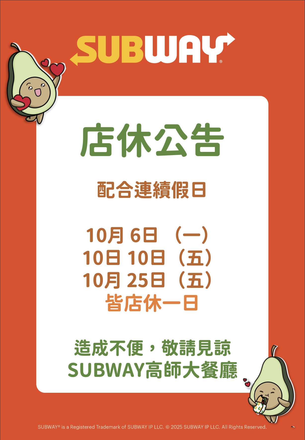 【保管組公告】🚨🥪 SUBWAY 高師大餐廳緊急公告! 🥪🚨