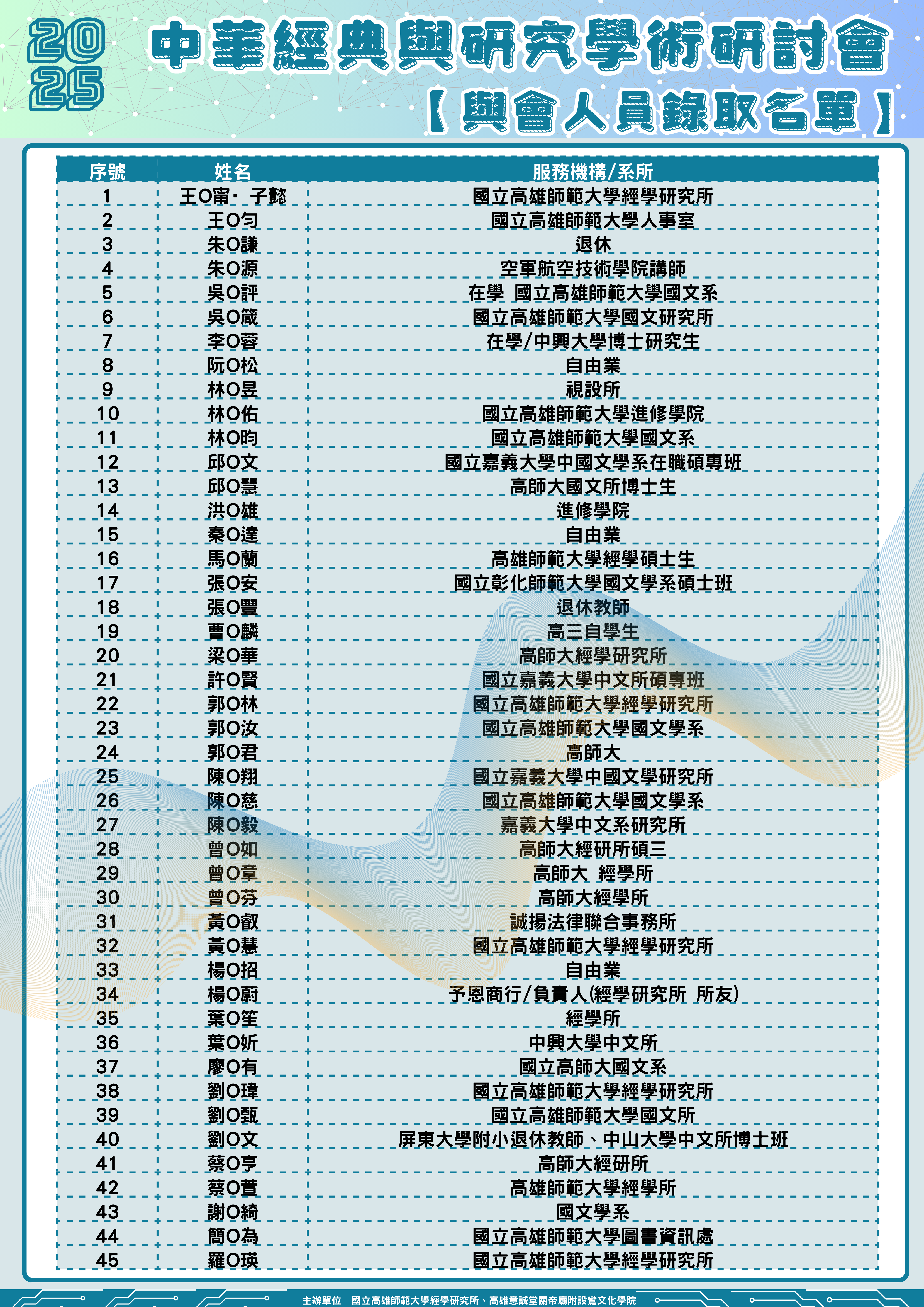【經學研究所】《2025中華經典與研究學術研討會》與會人員錄取名單