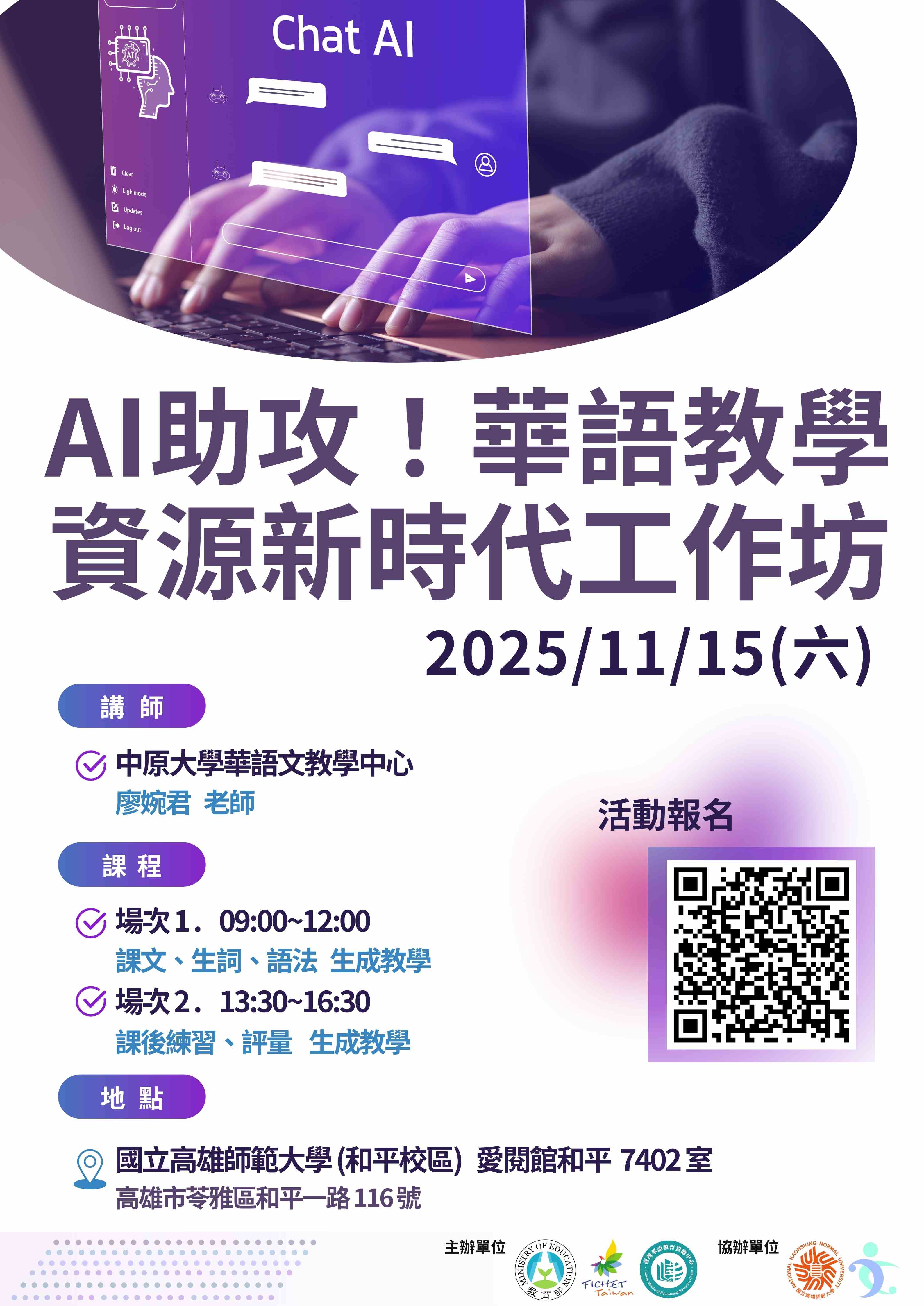 ● 地點:國立高雄師範大學 愛閱館和平 7402教室 (高雄市苓雅區和平一路116號)