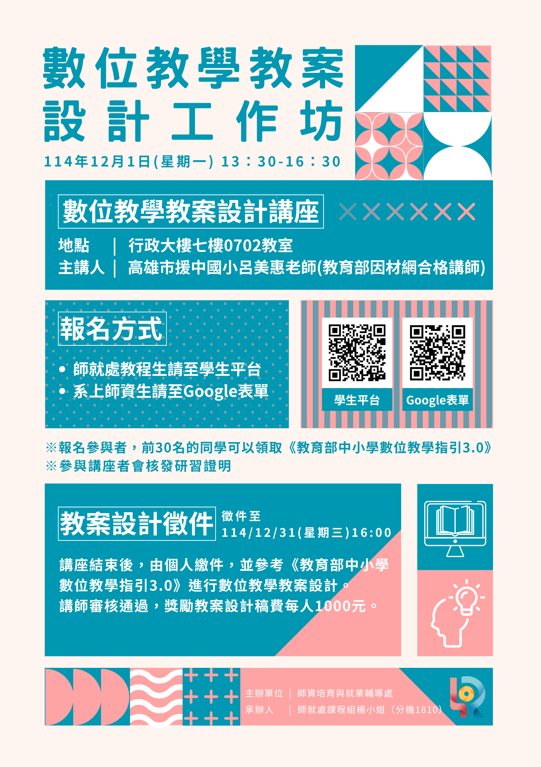 講座結束後,由個人繳件,並參考《教育部中小學數位教學指引3.0》進行數位教學教案設計,徵件至114年12月31日(星期三)16:00止,繳交教案電子檔(PDF及WORD檔)至https://forms.gle/Ay9UE7nNoGym6FJg7 ,檔案名稱「數位教學教案徵件+○○○(姓名)」。