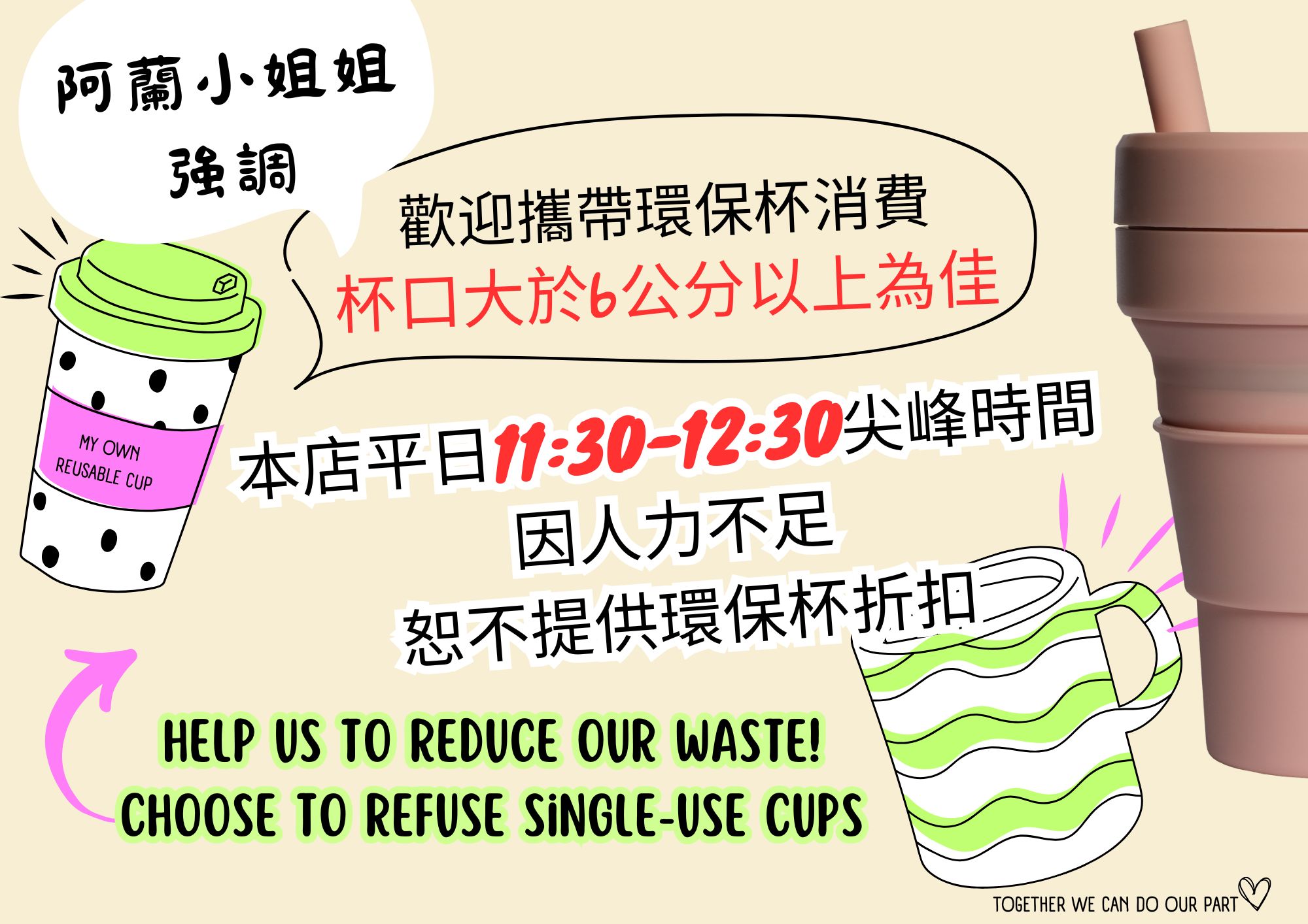 避開尖峰:為了作業效率,用餐尖峰時間恕不接受環保杯,建議避開人潮再來。