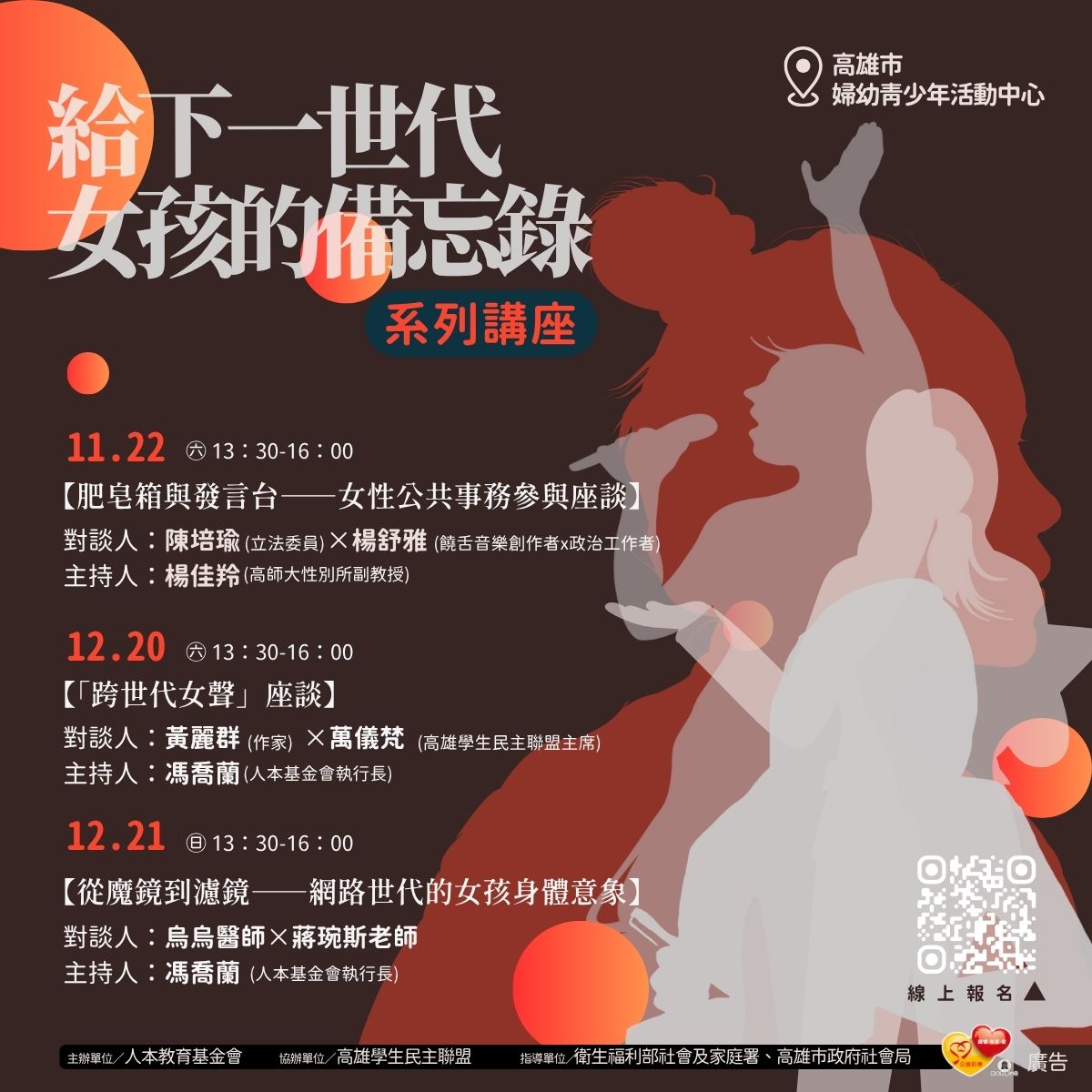 8號基地(鳳山區光復路二段120號),舉辦三場《給下一世代女孩的備忘錄》系列講座(附件一、二)。