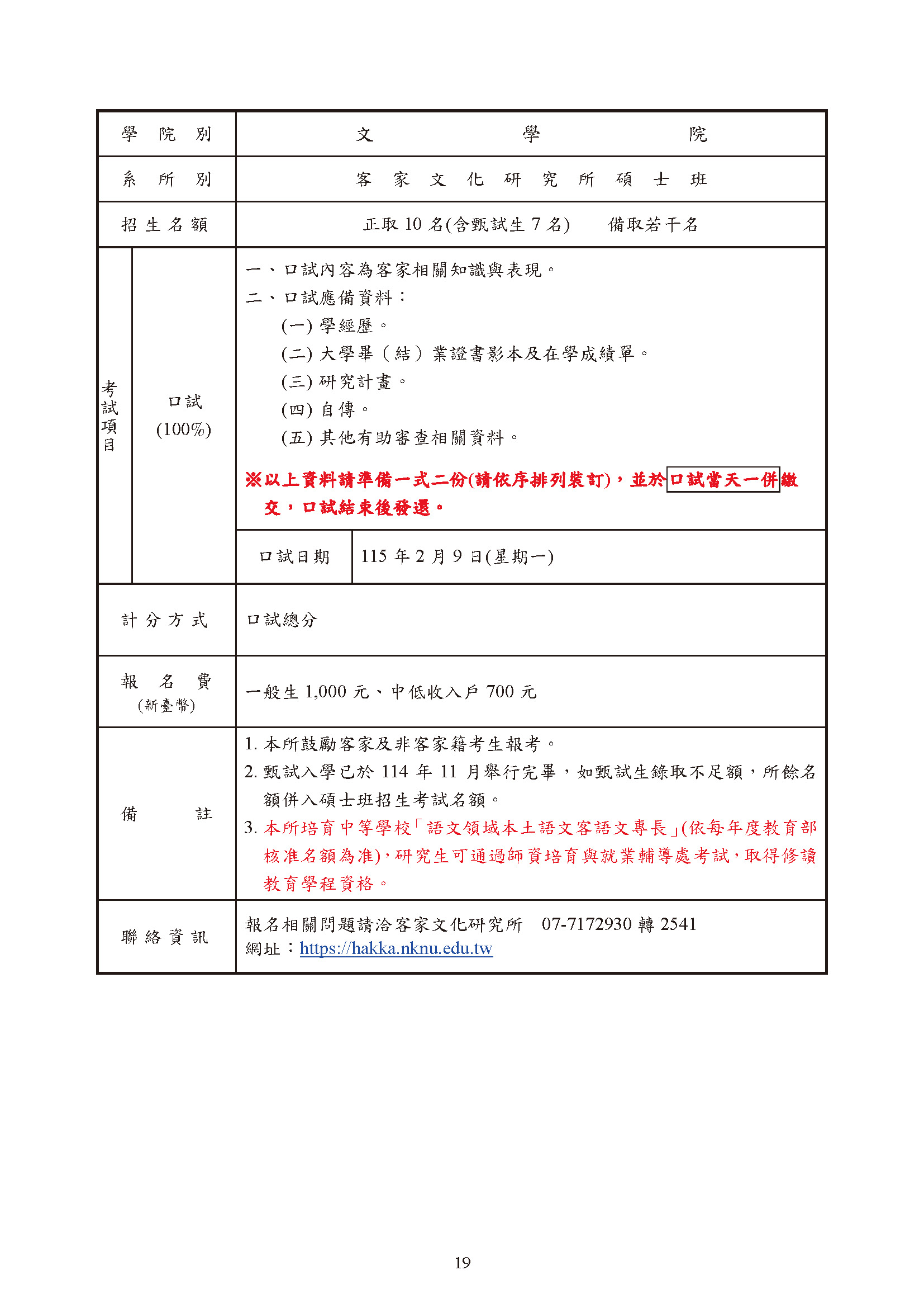 國立高雄師範大學客家文化研究所115學年度招生入學考試