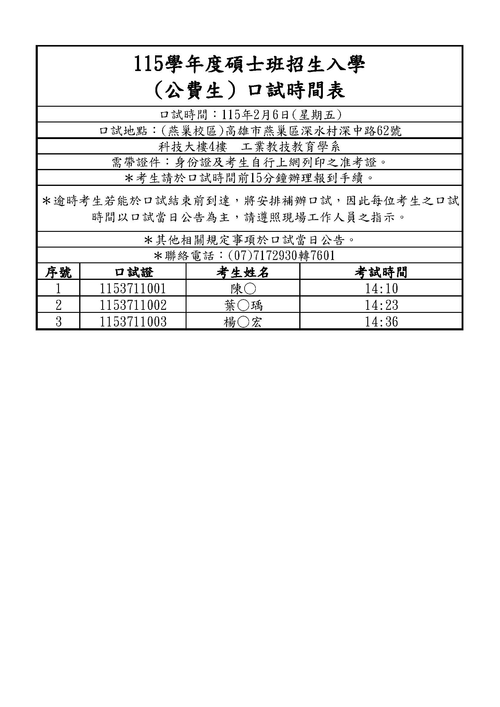 【工教系】115學年度碩士班考試(含公費生)口試日程表—115/2/6(星期五)