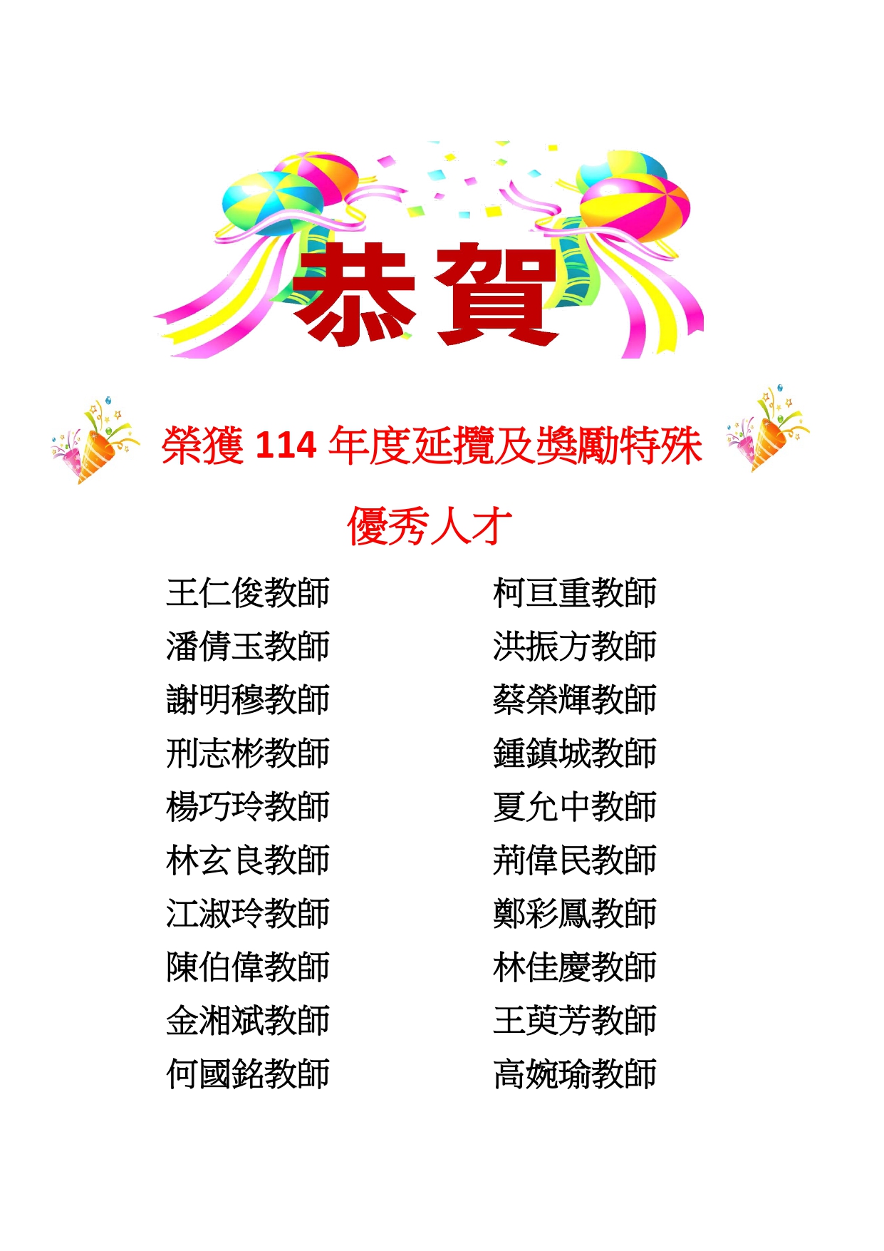 恭賀本校教師榮獲114年度「延攬及獎勵特殊優秀人才」教師殊榮