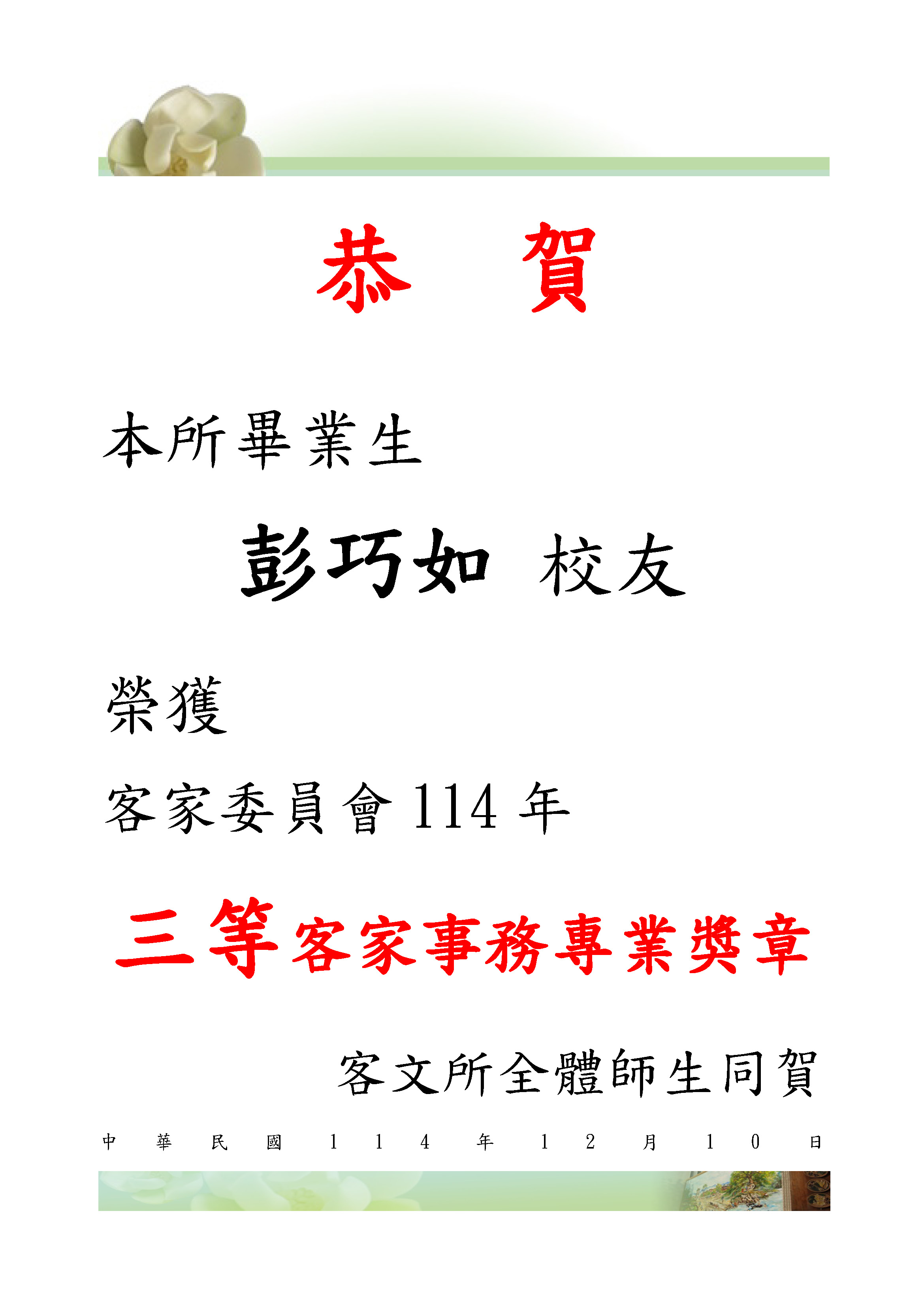 賀榜(彭巧如榮獲114三等客家事務專業獎章).jpg (612011 Kb)