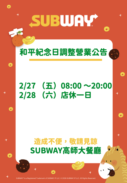 【保管組公告】📣【Subway高師大餐廳|228 連假營業時間調整公告】