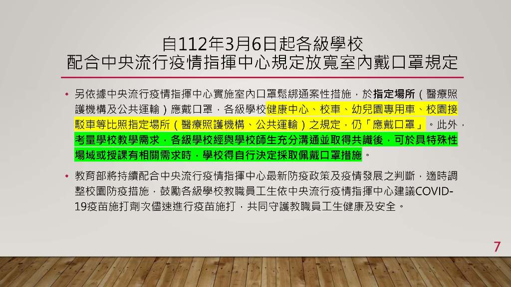 另依據中央流行疫情指揮中心實施室內口罩鬆綁通案性措施,於指定場所(醫療照護機構及公共運輸)應戴口罩,各級學校健康中心、校車、幼兒園專用車、校園接駁車等比照指定場所(醫療照護機構、公共運輸)之規定,仍「應戴口罩」。此外,考量學校教學需求,各級學校經與學校師生充分溝通並取得共識後,可於具特殊性場域或授課有相關需求時,學校得自行決定採取佩戴口罩措施。