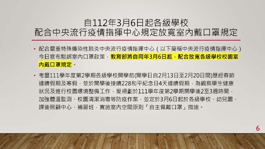 配合嚴重特殊傳染性肺炎中央流行疫情指揮中心(以下簡稱中央流行疫情指揮中心)今日宣布鬆綁室內口罩政策,教育部將自同年3月6日起,配合放寬各級學校校園室內戴口罩規定。