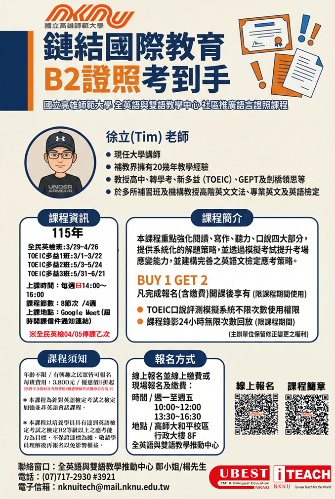 本課程採策略模組化教學,針對聽、說、讀、寫四項能力進行重點強化,邀請補教界名師徐立(Tim)老師並提供解題策略、應考模板、AI 口說評測系統及課程錄影回放,協助同學有效準備並取得 B2 等級英語證照,提升升學、實習與就業競爭力。
