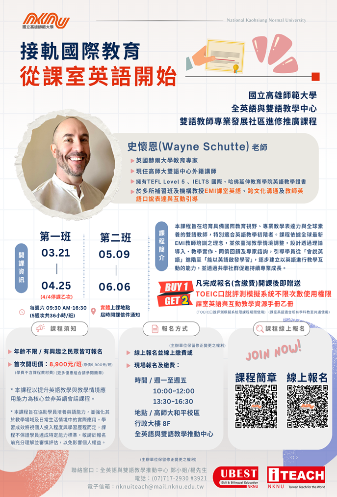 本課程由 EMI 教學實務經驗之外籍講師史懷恩(Wayne Schutte)老師以英語授課,著重課室英語實用表達、教學互動語言及真實教學情境演練,協助同學從「會說英語」進階到「能以英語進行教學與引導」,為未來教學實習與職涯發展提前做好準備。