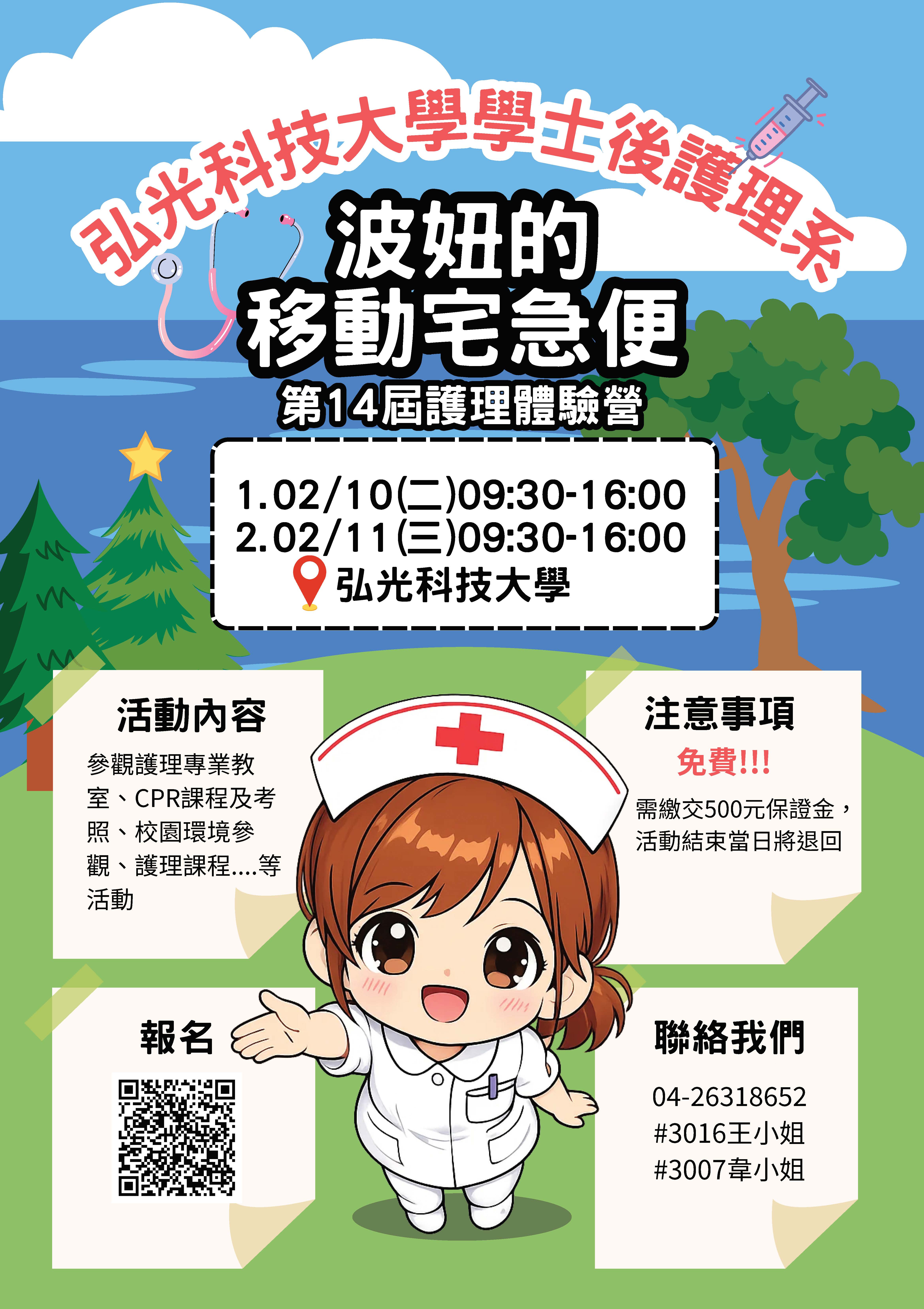 弘光科技大學學士後護理系於115年02月10日(二)及115年02月11日(三)辦理「護理體驗營活動」,歡迎踴躍報名參加,請參閱說明及附件。