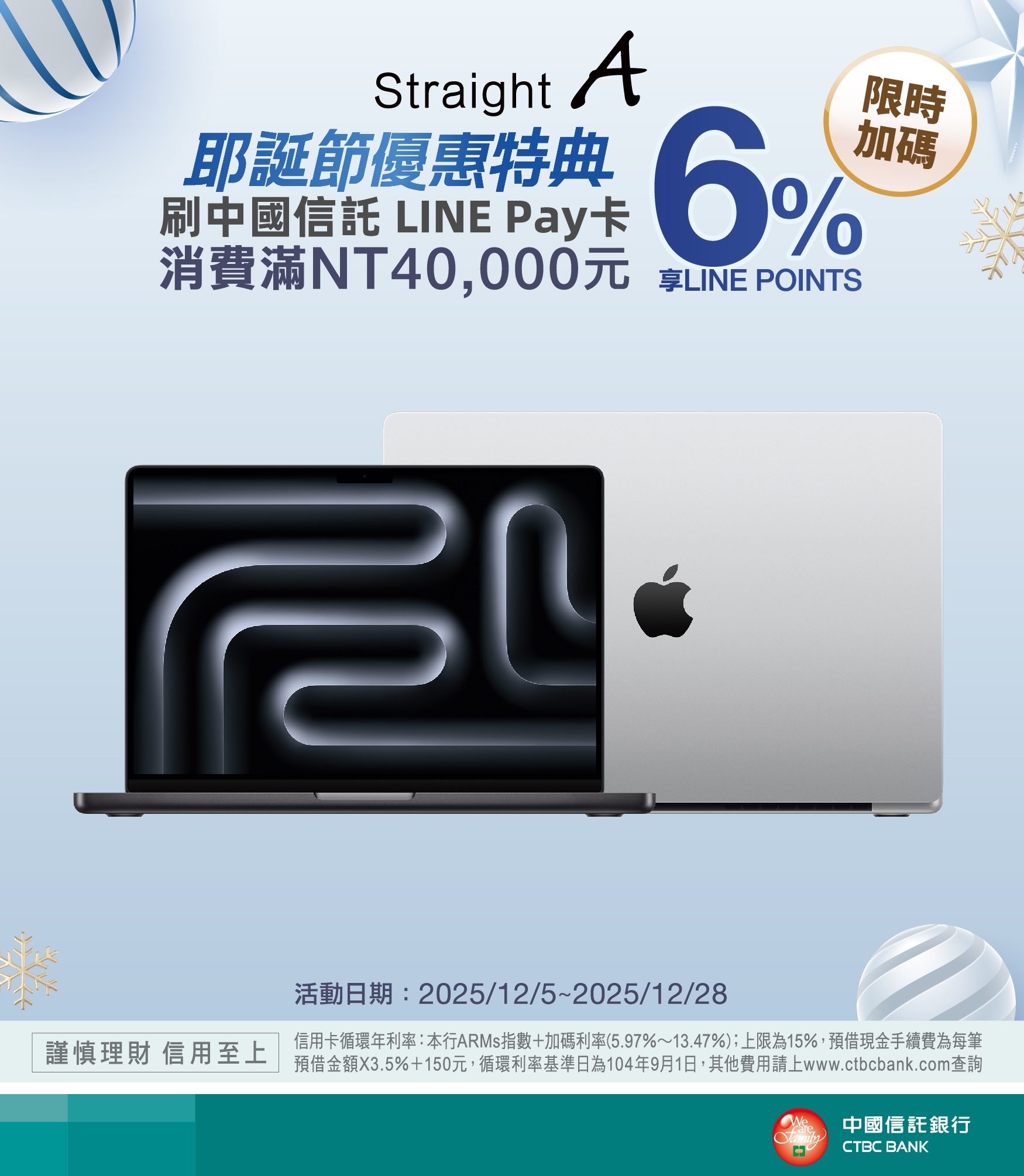🎄聖誕驚喜加碼!Straight A 刷中信Line Pay聯名卡 回饋直接翻倍!