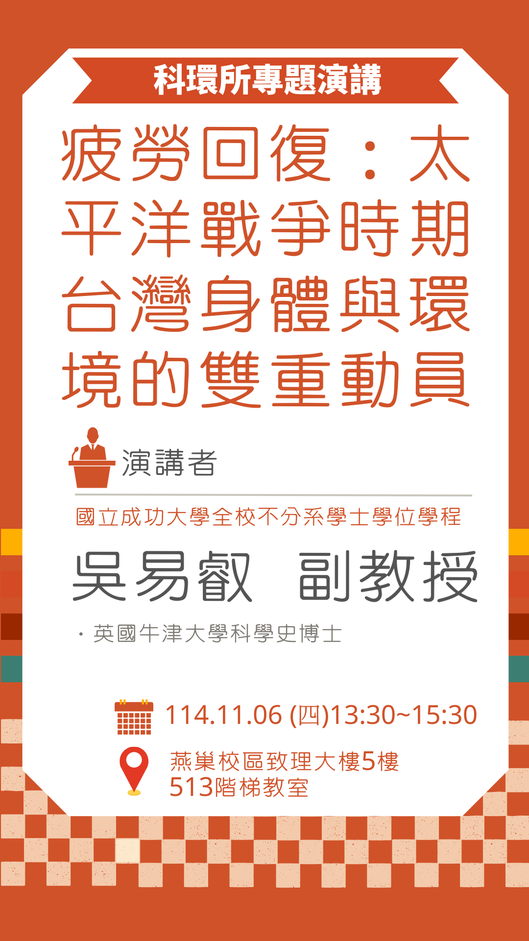 【科環所】114年11月06日專題演講: 疲勞回復:太平洋戰爭時期台灣身體與環境的雙重動員