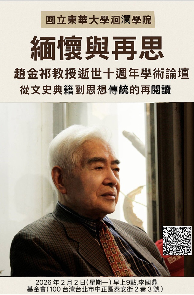 為緬懷已故趙金祁教授在文史研究、科學教育與跨域學術推動上的卓越貢獻,並在其逝世十週年之際重新省思其學術精神與思想資產,國立東華大學洄瀾學院謹訂於 2026 年 2 月 2 日(星期一) 舉辦「緬懷與再思:趙金祁教授逝世十週年學術論壇——從文史典籍到思想傳統的再閱讀」。