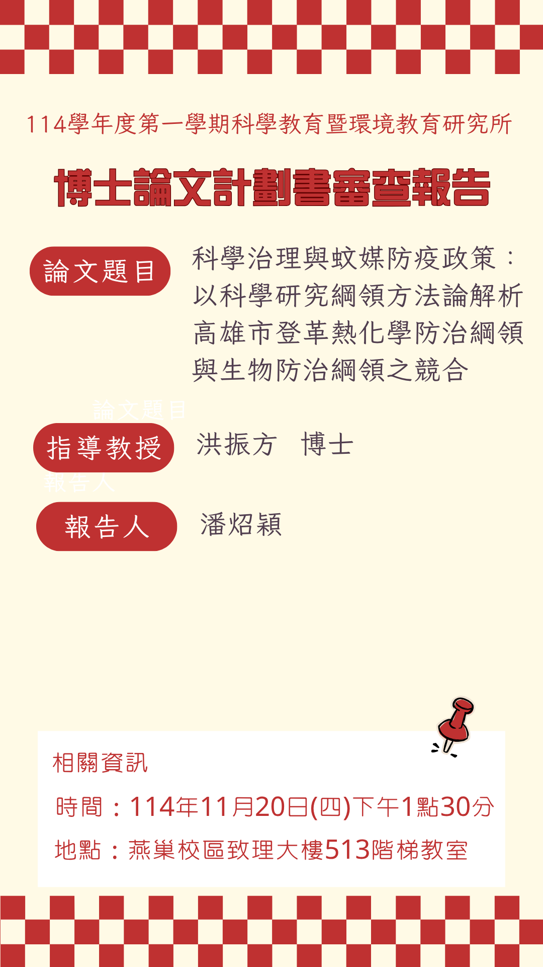 【科環所】11月20日博士論文計劃書審查報告