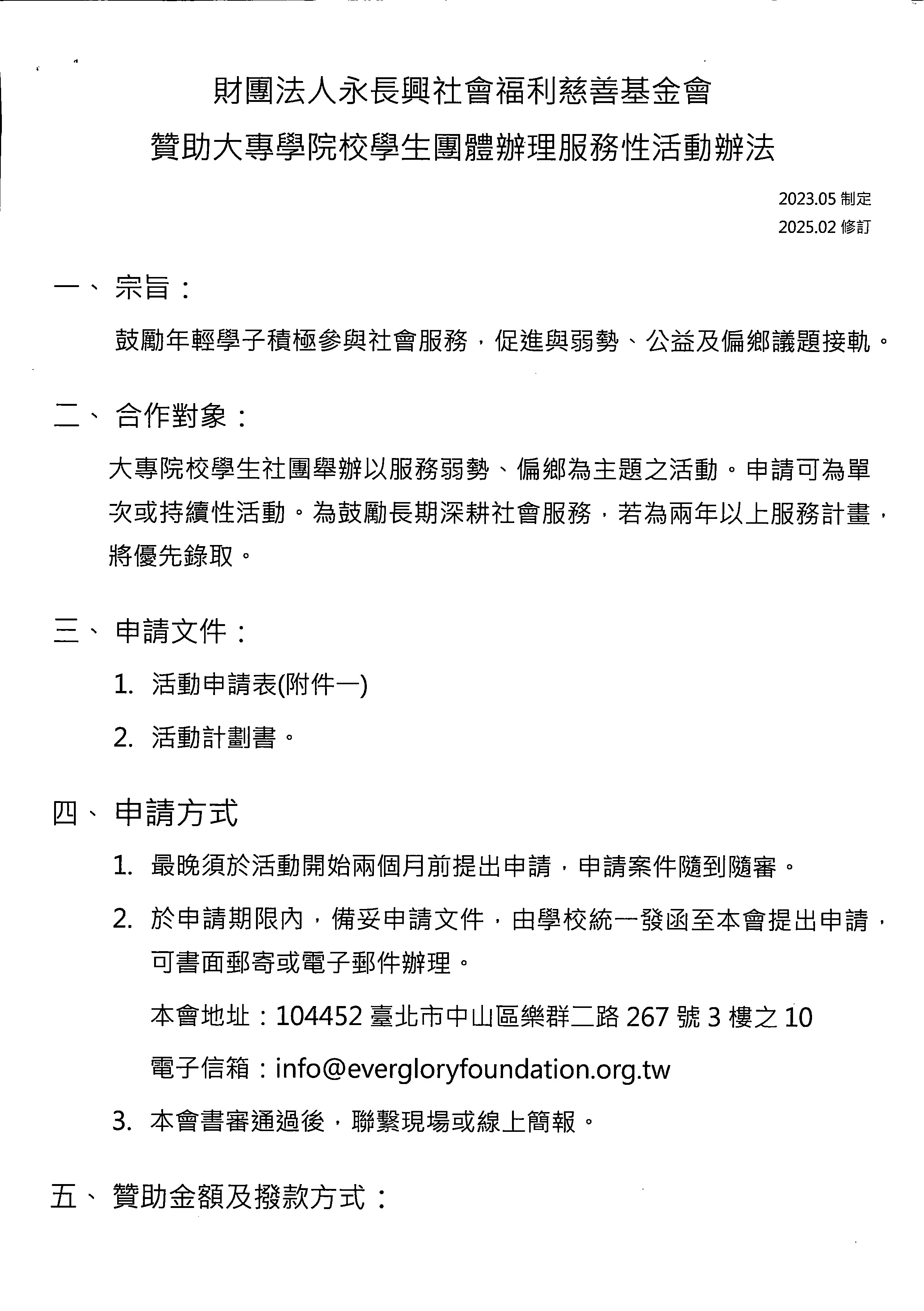 轉知財團法人永長興社會福利慈善基金會<贊助大專學院學生團體辦理服務性活動辦法>,各社團/系學會之暑假服務隊有意申請者,請自行參閱附件來文。