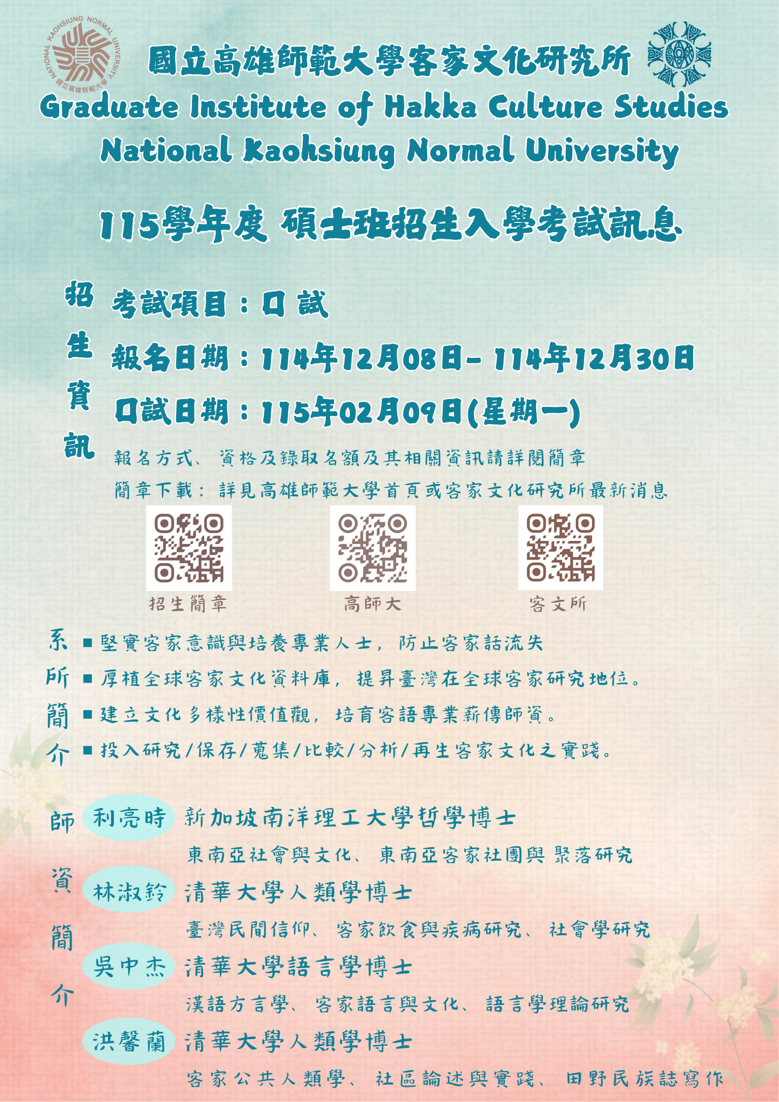 國立高雄師範大學客家文化研究所115學年度招生入學考試