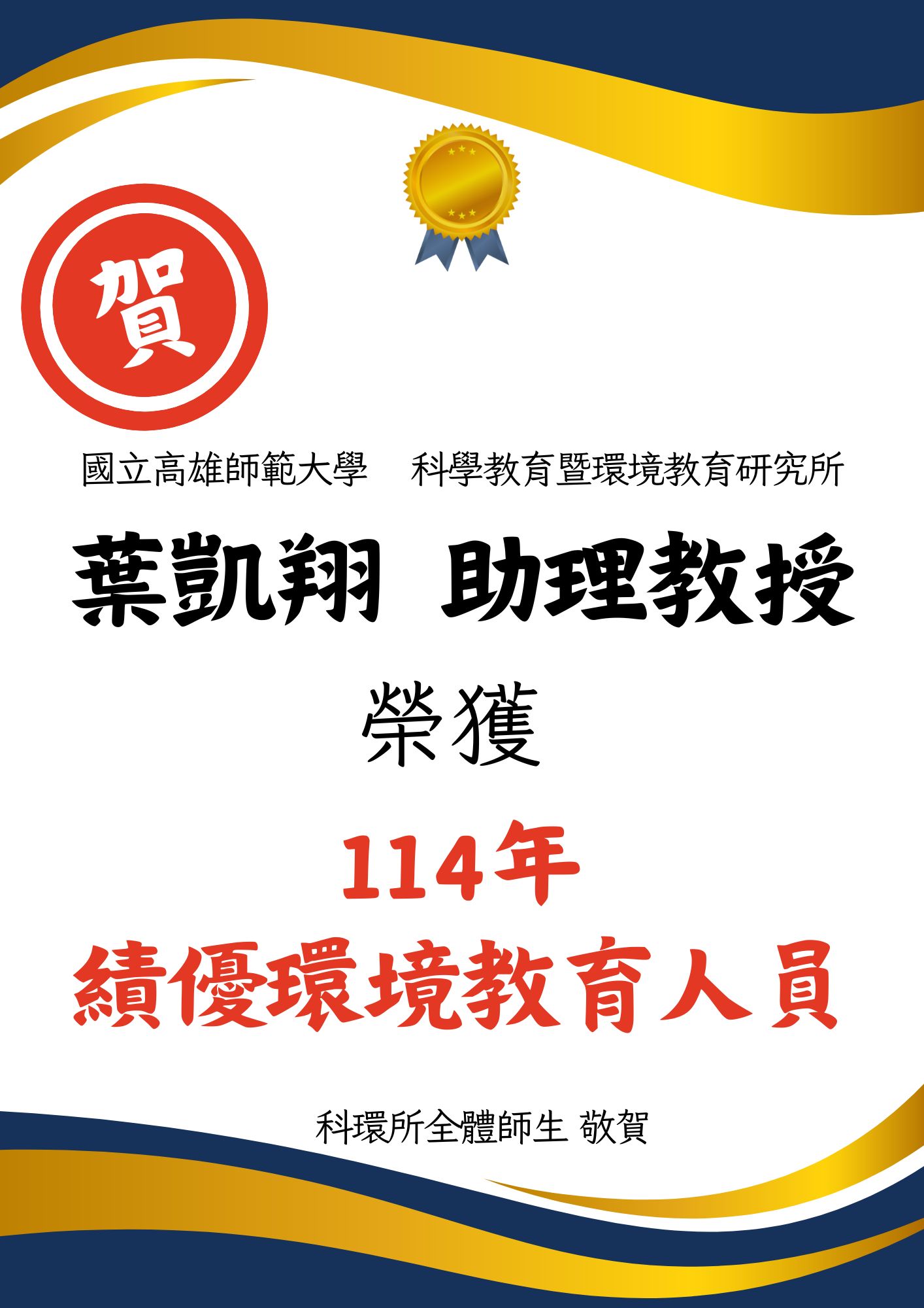 恭賀!!本所葉凱翔老師 榮獲114年績優環境教育人員