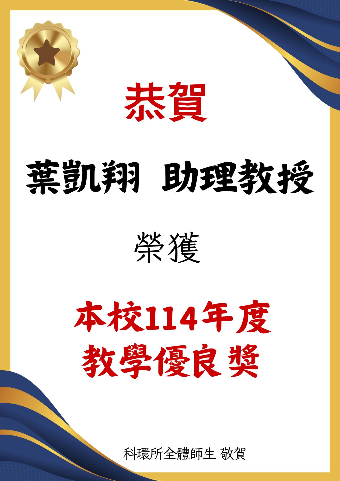 恭賀!!本所葉凱翔老師 榮獲本校114年度教學優良獎