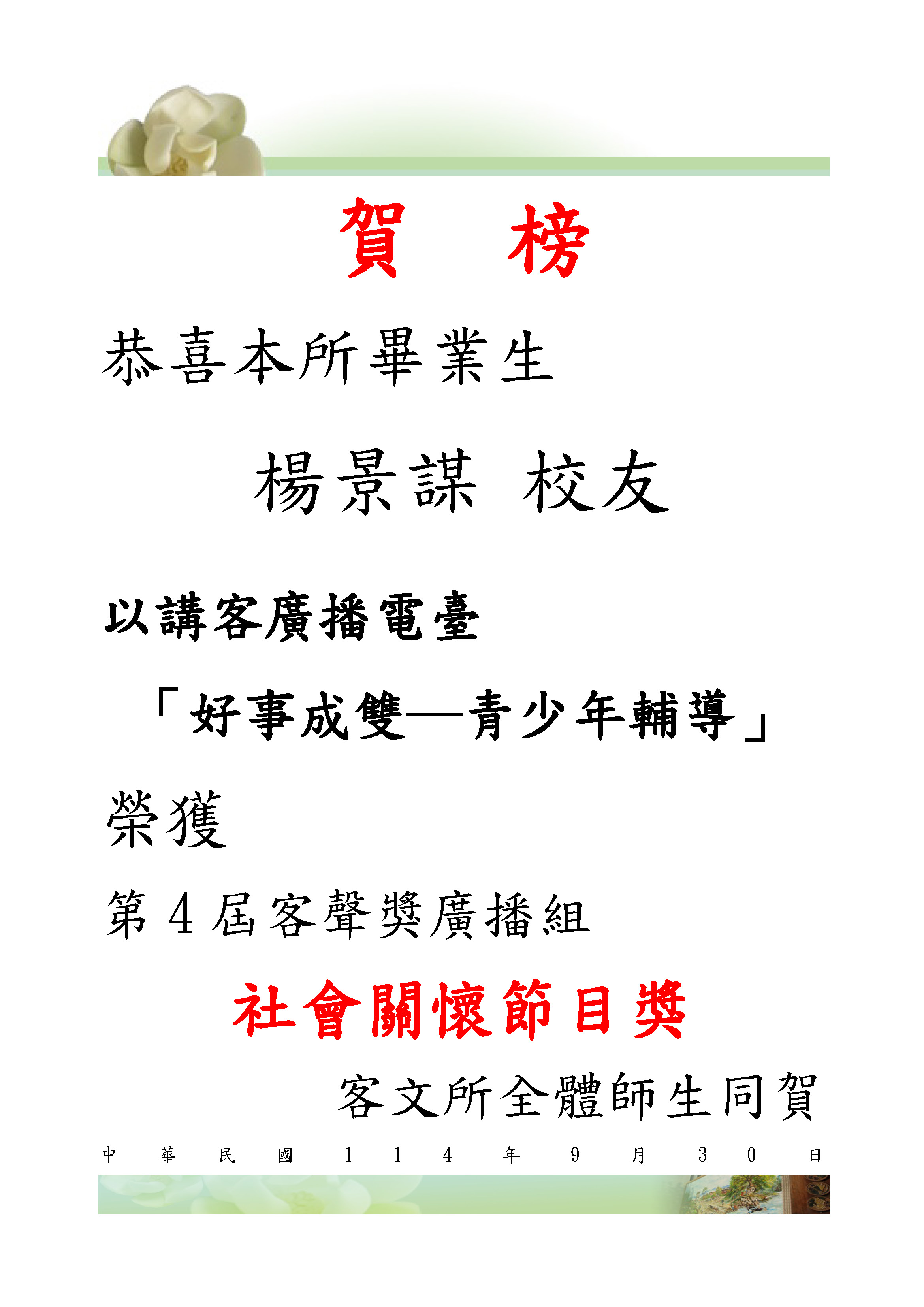 賀榜(楊景謀榮獲第4屆客聲獎廣播組社會關懷目獎).jpg (663.4208984375 Kb)