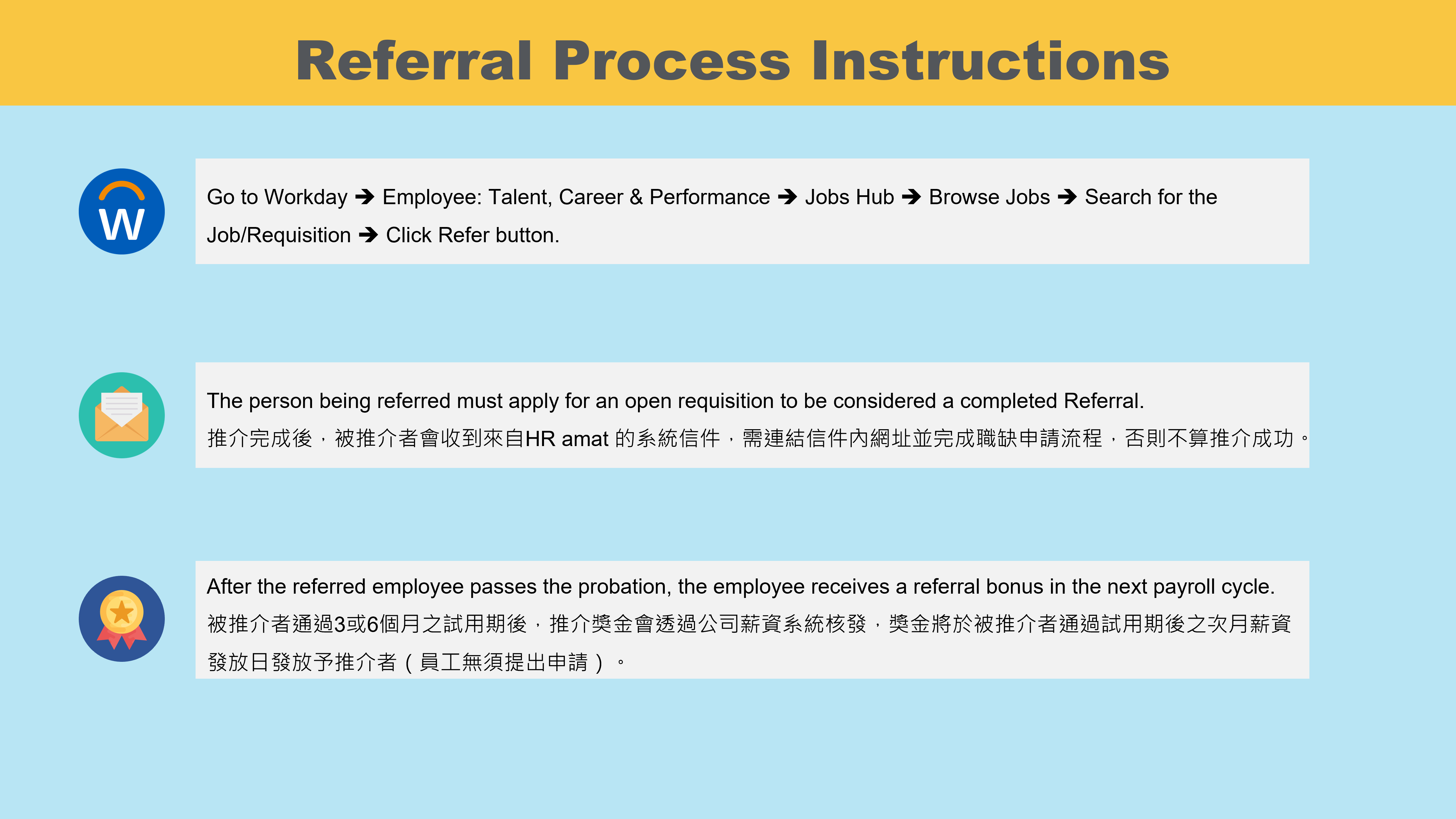 Check status in Workday: My Referral Report. For any questions, contact: Claudia_Hsu@amat.com