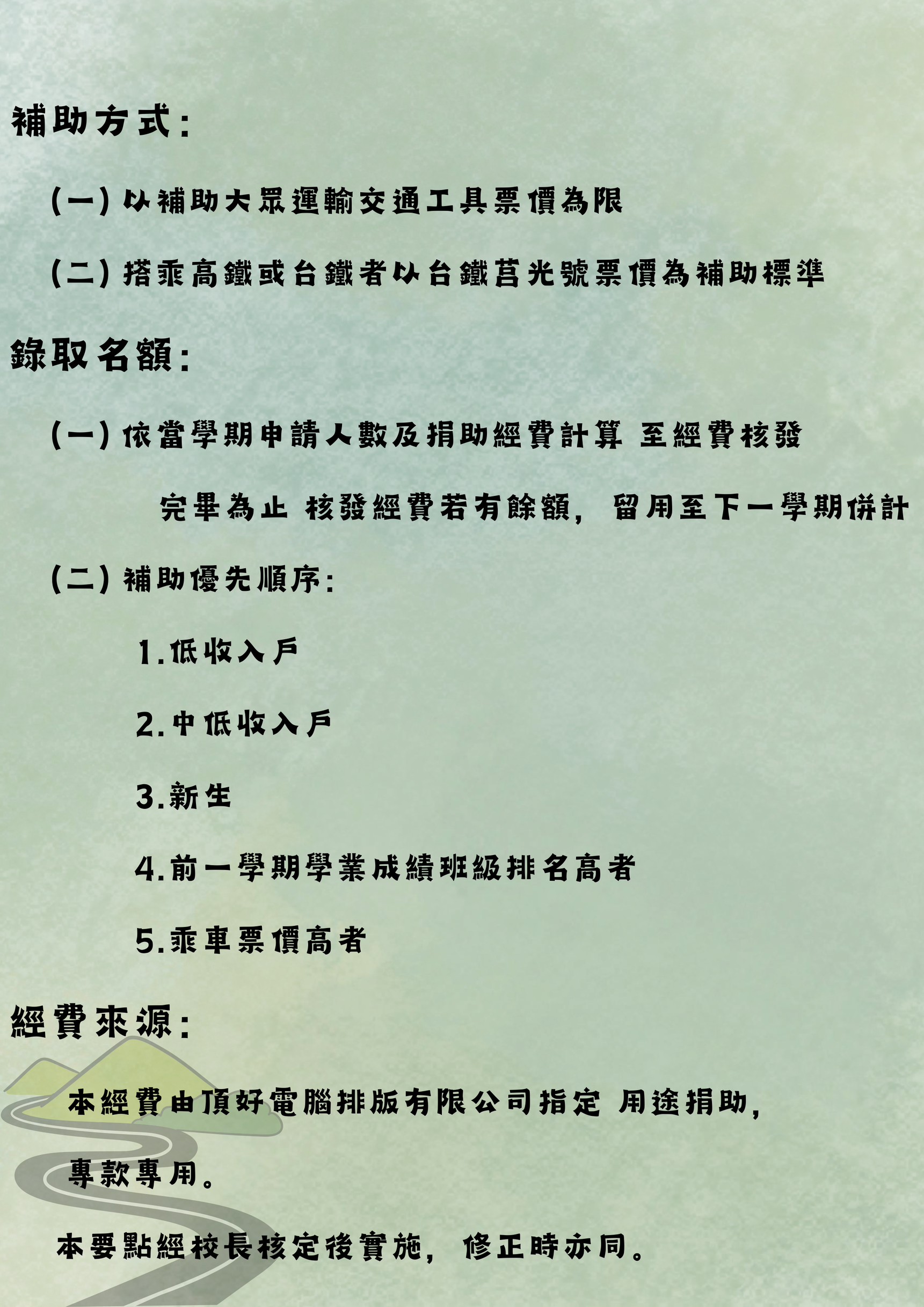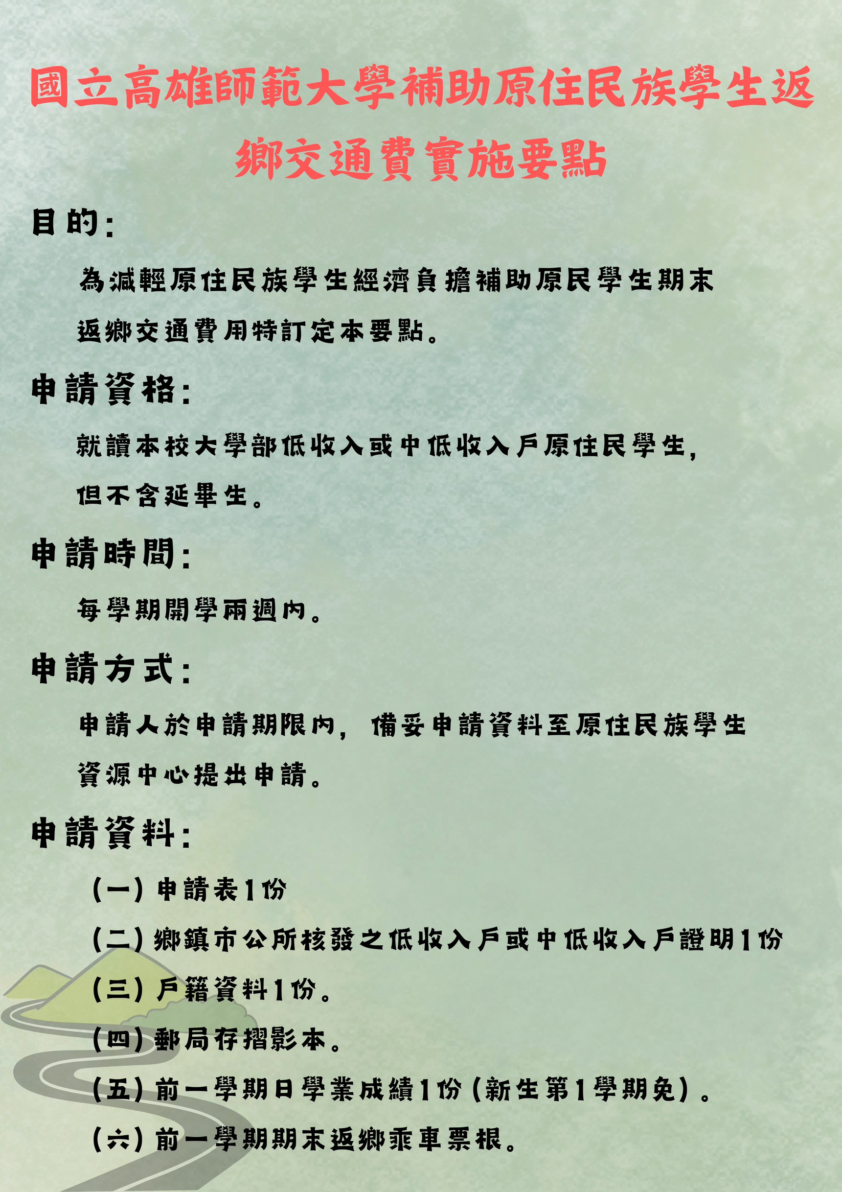 申請資格:就讀本校大學部低收入或中低收入戶原住民學生,但不含延畢生。
