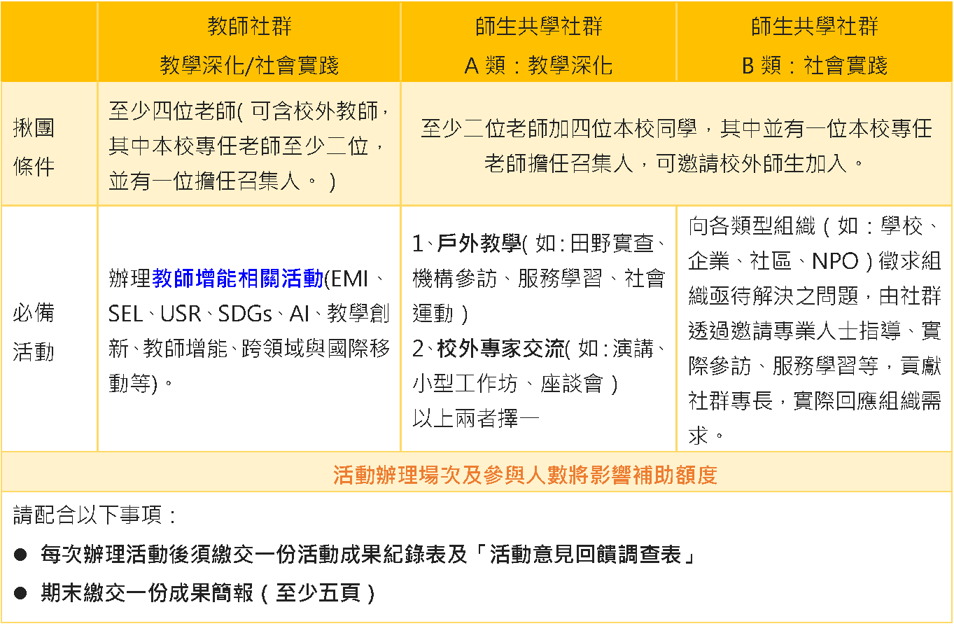 1.社群活動規劃為EMI、SEL、USR、SDGs、AI、教學創新、教師增能、跨領域與國際移動之性質者將優先補助。