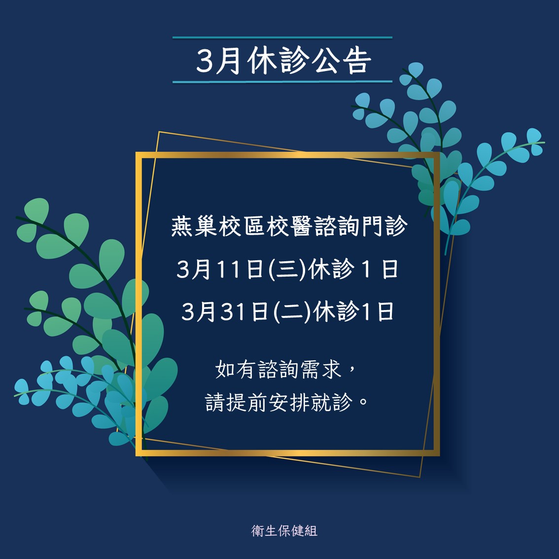 115/3/11、3/31燕巢校區校醫諮詢門診暫停服務