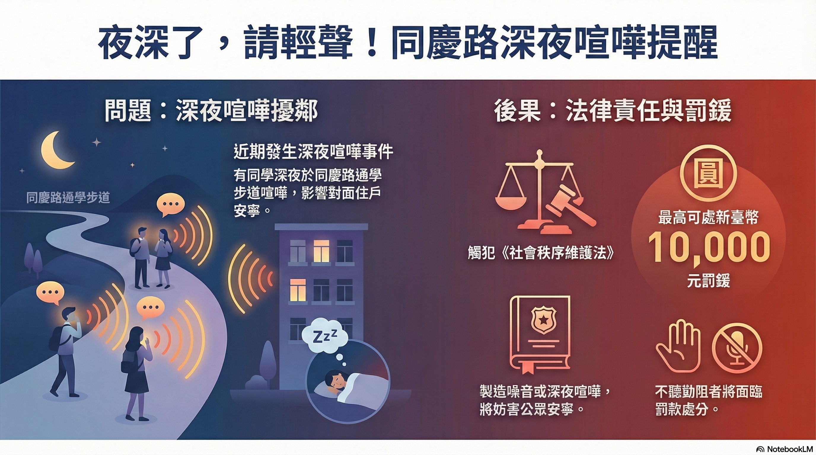 依本日同慶路住戶轉知,近日有同學深夜於同慶路通學步道喧嘩影響對面住戶安寧!校安中心提醒同學深夜勿於同慶路通學步道喧嘩以免影響安寧並可能被依《社會秩序維護法》第72條第2款:製造噪音或深夜喧嘩,妨害公眾安寧,不聽禁止者,處新臺幣一萬元以下罰鍰