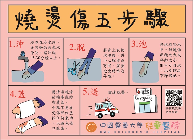 如發生燒燙傷情形,請立即依「沖」、「脫」、「泡」、「蓋」、「送」之步驟,做緊急處置,必要時前往醫院就醫。