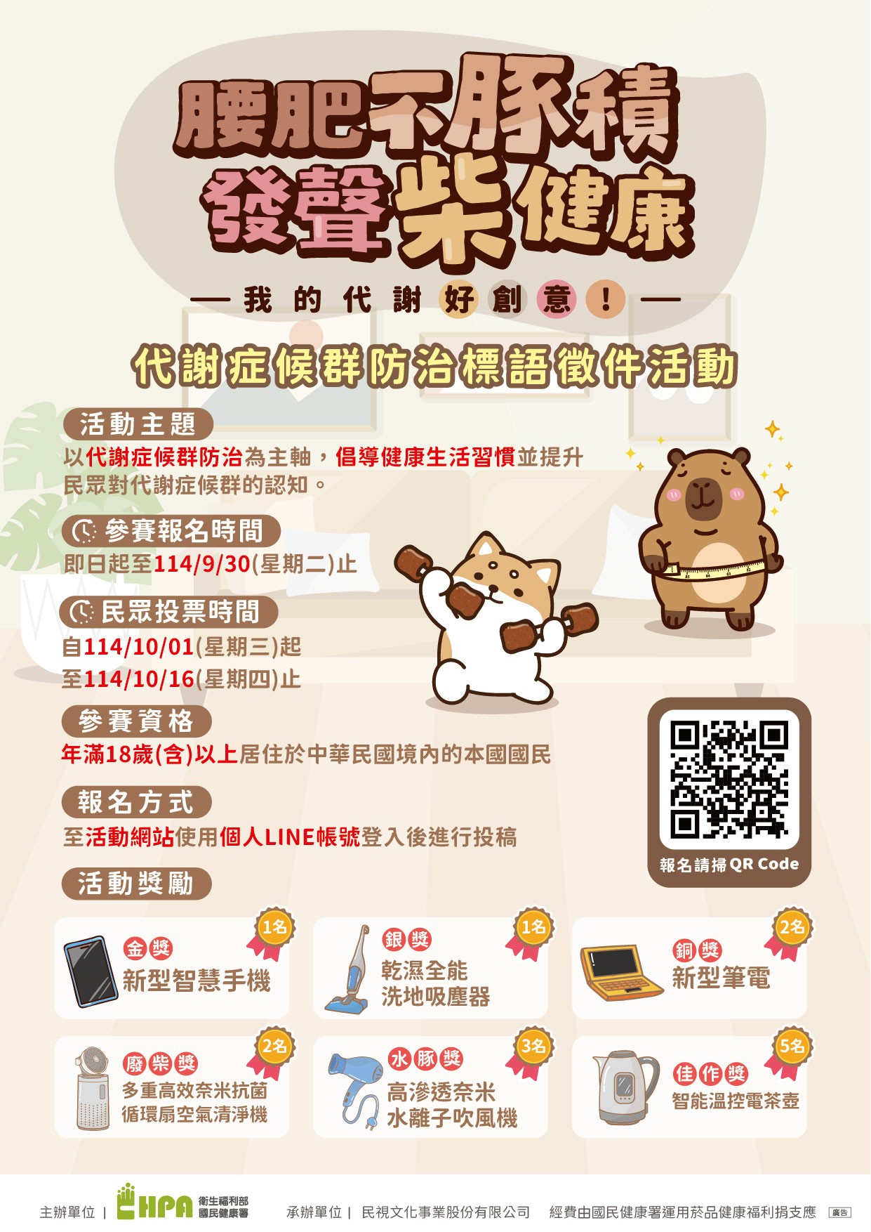 一、衛生福利部國民健康署為提升民眾對代謝症候群的認知特辦理「腰肥不『豚』積 發聲『柴』健康」代謝症候群防治標語徵件活動,鼓勵民眾以代謝症候群防治為主題,發想創意標語,倡導健康生活習慣,包含:認識代謝症候群五項危險因子,落實定期量腰圍、均衡飲食、規律運動、戒菸及定期健康檢查等健康行為。