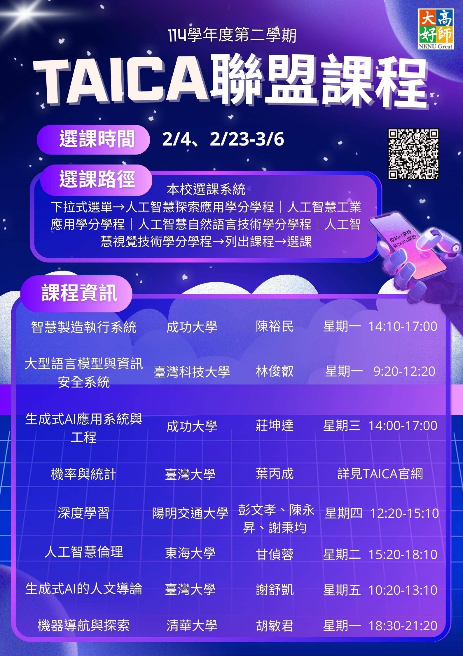 四、另本學期TAICA開設8門主導課程(詳見TAICA課程資訊)於上述時間開放選課,請同學把握機會修課。