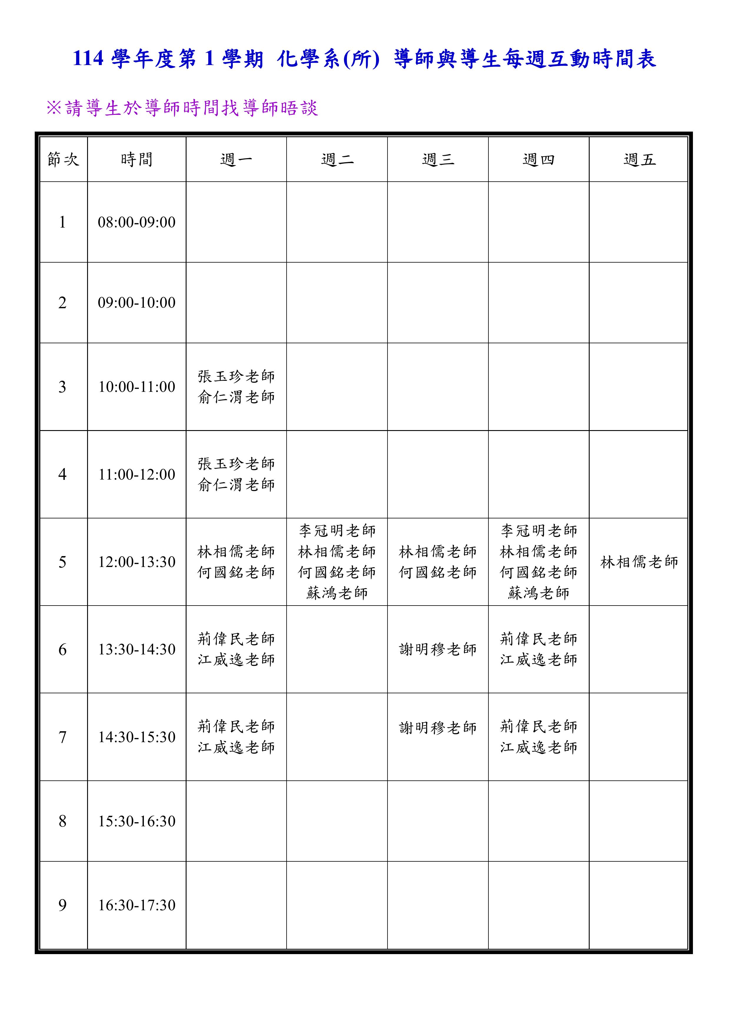 【化學系】114學年度第1學期導師與導生每週互動時間表